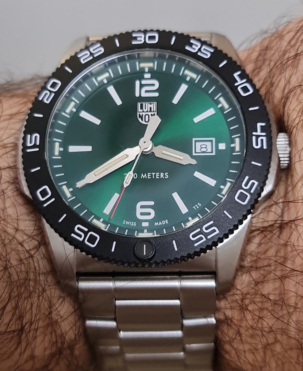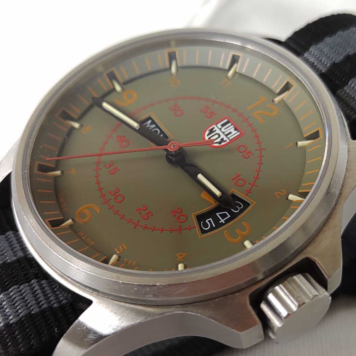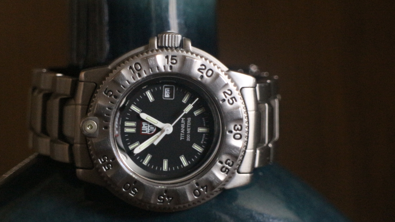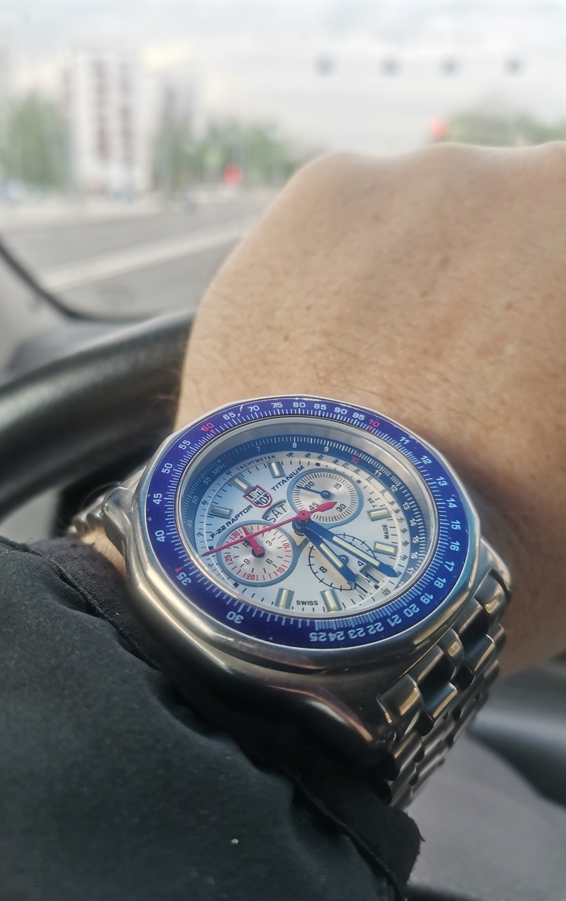 Luminox "3000 series" по бросовой цене. Вживую неожиданно понравился дизайн и вес, несмотря на стальную заднюю крышку. Но вот тригалайты на стрелках светили бодро (ну как бодро - как Marathon 2012 года), а циферблат грустно совсем, куда слабее стрелок. Часы по всем признакам не Китай, возможно кто-то из владельцев менял стрелки просто, ибо на часах был помимо всего след от хорошего такого падения с мотоцикла или велосипеда.