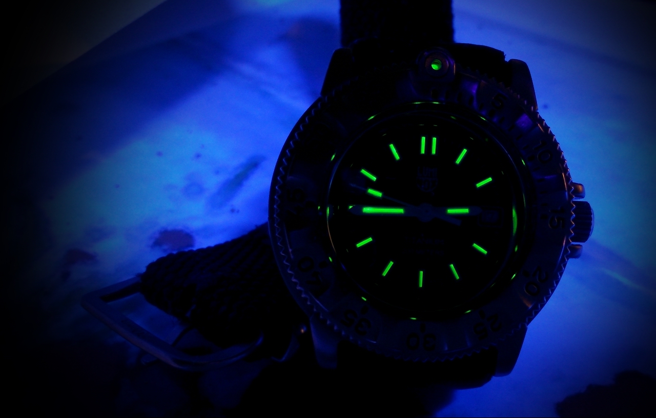 И недавно решил посвежее (чтоб светились пободрее) купить что-то из Люмов, но без фанатизма по деньгам, чисто легкие часы с тритием на природу. Нашел, судя по всем признакам, нелевый 3050/3950, ессно документов нет в комплекте. Пришли часы, вживую не Китай, стекло конечно чуть в коцках, безель немного обляпан краской, но в общем состояние вполне бодрое. Дизайн зашел на ура, как и вес. А вот тригалайты не порадовали - "маловато будет". Светятся на уровне или чуть слабее Marathona 2012 года выпуска. Но все ровно и одинаково, кстати вполне себе ярко ночью. То ли часы ровесники (что совершенно не исключено) , то ли в 200 долларовый армейский Maraton ставили T100, что вряд ли. И, как назло, Traser года назад поменял на Longines у приятеля, с которым редко пересекаемся - сравнить не могу
