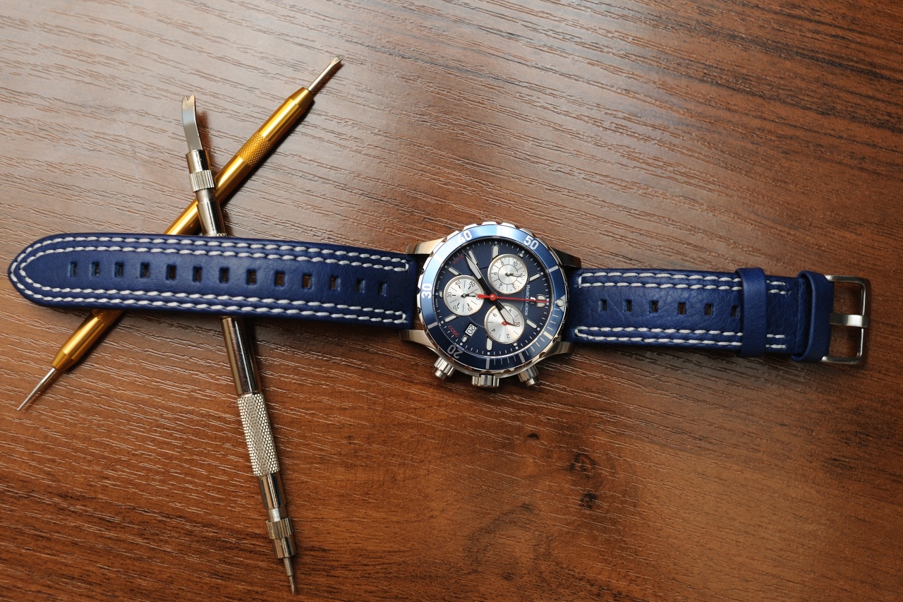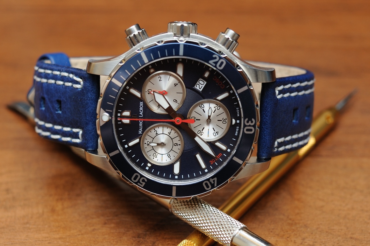 Захотелось мне прикупить ремень для Maurice Lacroix Miros Diver Chrono. Причем, часы у меня с синим цифером, что затруднило выбор. Думал о черном ремне с синей прострочкой или о просто черном... но как-то все не ложилось на душу. Был, правда, один интересный вариант -- черный ремень с двухцветной прострочкой, синей и белой, но цена была 60 евро, что я посчитал как-то уже слишком. И тут, вдруг, мне на глаза попался он. Его зовут Piero