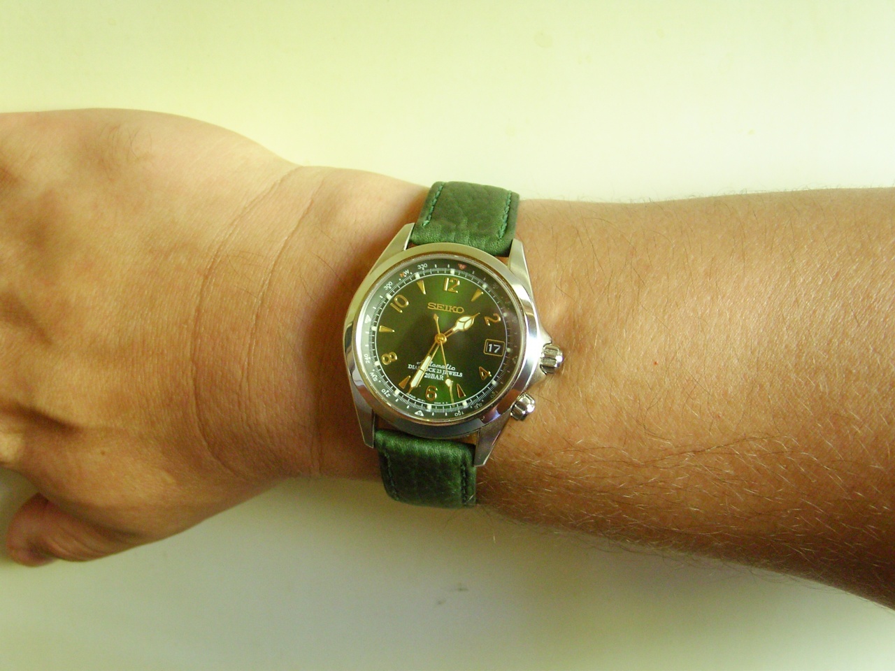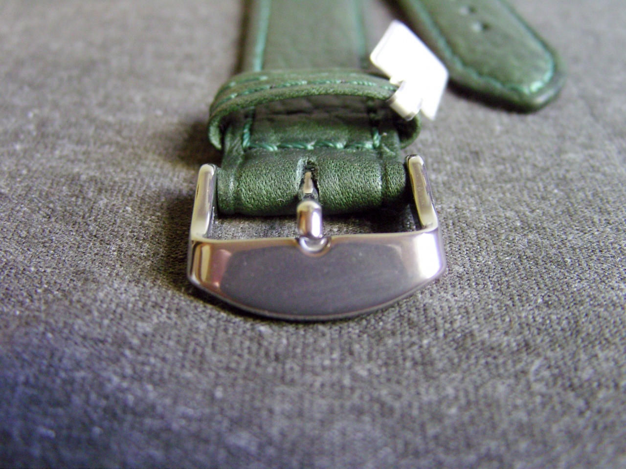 Не скрою, когда просматривал все страницы, посвященные предмету нашего общего обожания и поклонения, надеялся найти альтернативный коричневому ремень, который бы мог составить хоть какую-то конкуренцию априорно коричнево-зеленому сочетанию. Не могу сказать, что вариантов было очень много, поэтому пришлось напрячь остатки воображения, совершить этакий brainstorm, дабы представить, как может выглядеть то, что мне понравится, после чего, продолжая нещадно потеть мозгами, начал просматривать многочисленные предложения кожевенных тюнингистов и продавцов. На одном очень известном и популярном сайте начали попадаться интересные варианты, снаряды падали все ближе, пока не обнаружилось несколько вариантов и, после вдумчивого, хотя и во многом умозрительного выбирания, осталось два (зеленых) - блестяяяяшшшая змеиная красота (все же отвергнутая из-за чрезмерной блестяшшшести, инда в глазах рябило - но зеленая, пакость!) и тот вариант, на котором решил остановиться. Матовая кожа, с тиснением, прострочена зеленой нитью, СПОКОЙНЫЙ зеленый цвет, кмк, вполне сочетающийся с циферблатом Альпа и дополняющий его, как и наоборот. Померив его с родной баклей, решил прикинуть заказанную там же бабочку (матовую - прекрасно подошла к матовым частям часов, да и царапки меньше видны), после чего, удовлетворенный, устало расслабился.