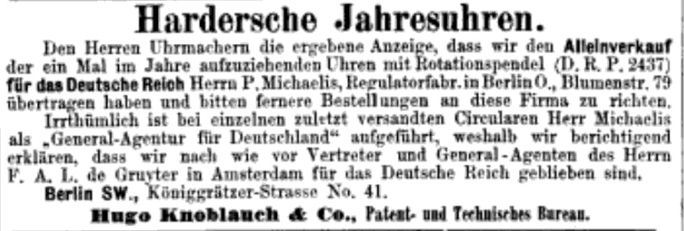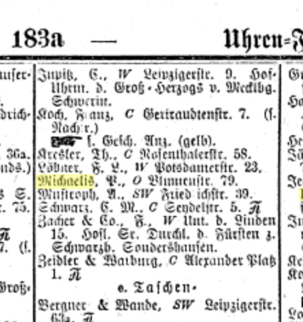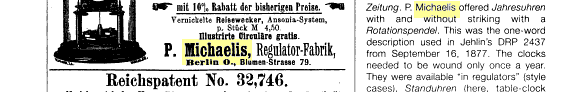 Michaelis значится в списках часовщиков и торговцев часами. В 1877 году они выпустили следующую заметку в газете DUZ: "1 апреля 1877 года производители регуляторов P.