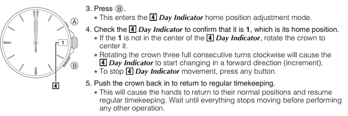 Если нужна еще калибровка даты, то после шага 3 нажать на B, дата перейдет на цифру "1" и отрегулировать окошко даты по центру с помощью ЗГ. (Обязательно должна стоять "1", если нет, то нужно вручную поставить)