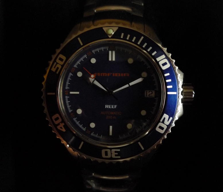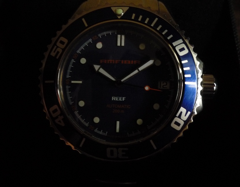 На синем Рифе ,полностью рыжая стрелка возможно пришлась бы к месту ... Хотя тут при неярком освещении, за счет черной части стрелки возникает иллюзия, что ее кончик движется сам по себе ....Тоже прикольно...