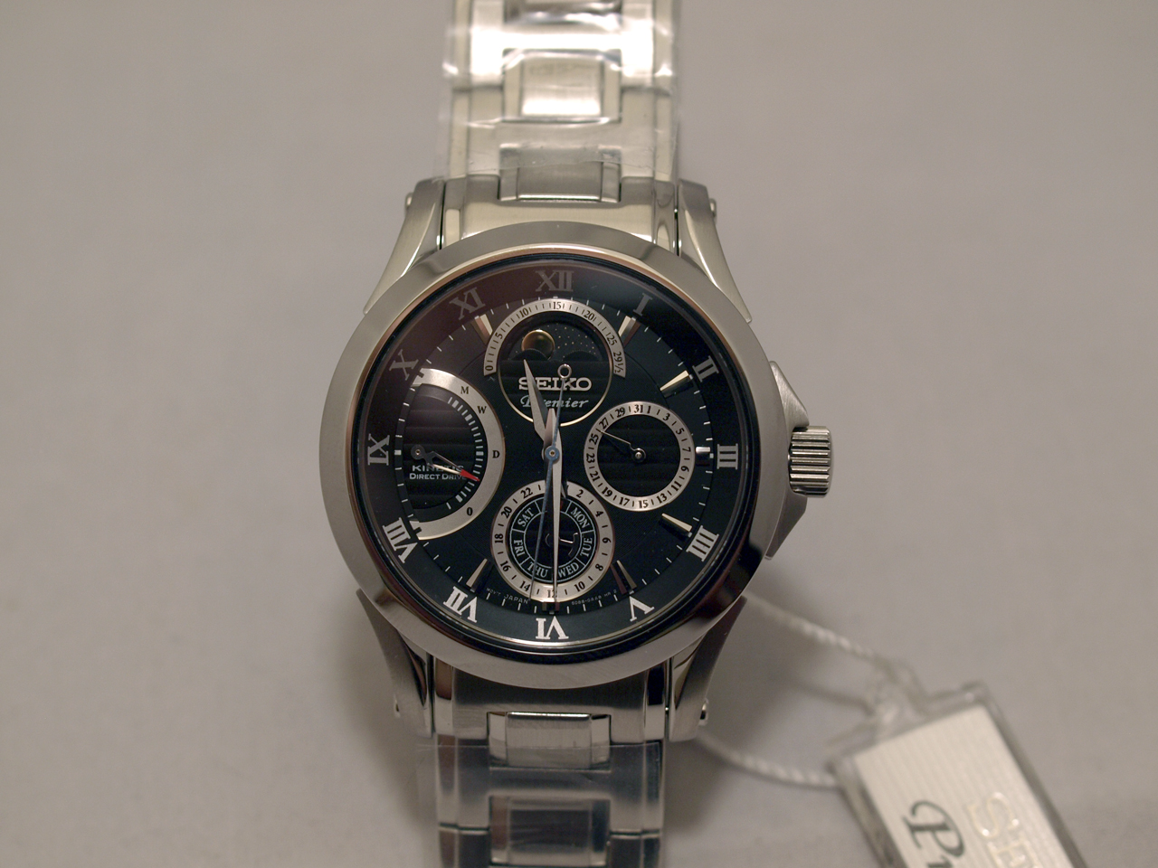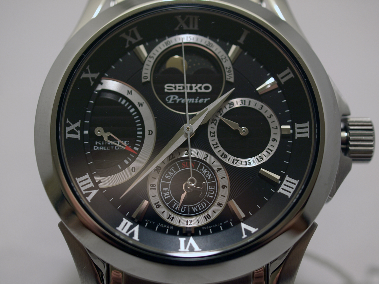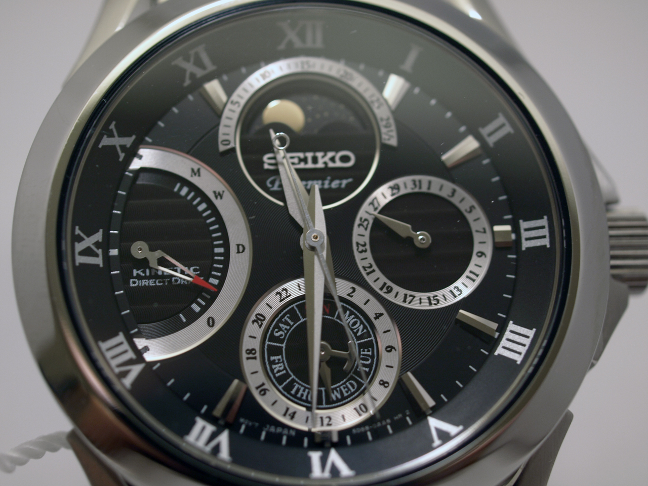 Seiko. Черный циферблат, стальной браслет на складной застежке, календарь, автоподзавод и возможность прямого завода с интерактивной индикацией уровня накопленной энергии, фазы луны - всё это собрано компанией