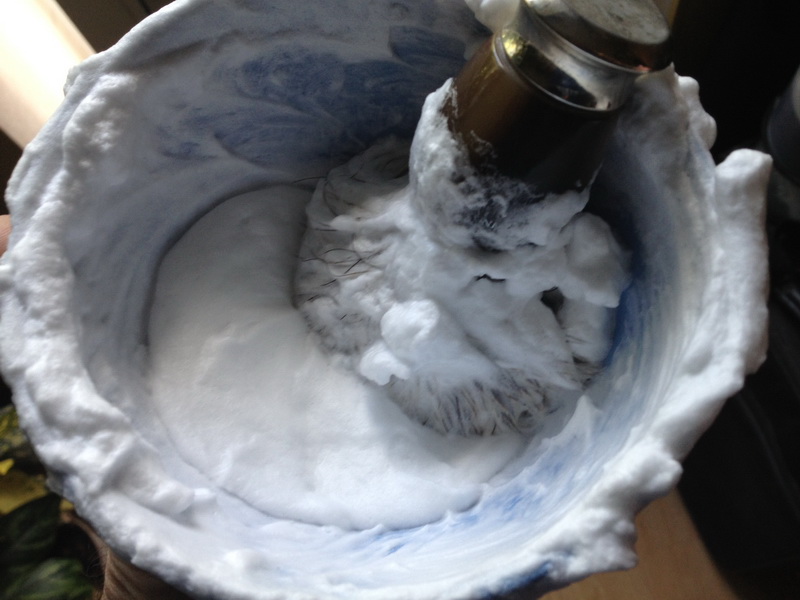 Потом слил воду из банки с мылом, разок слегка стряхнул помазок и начал вращать им в банке, набирая мыло.Сделал в банке с мылом за пол-минуты где-то 100 вращений и начал взбивать пену в чашке.