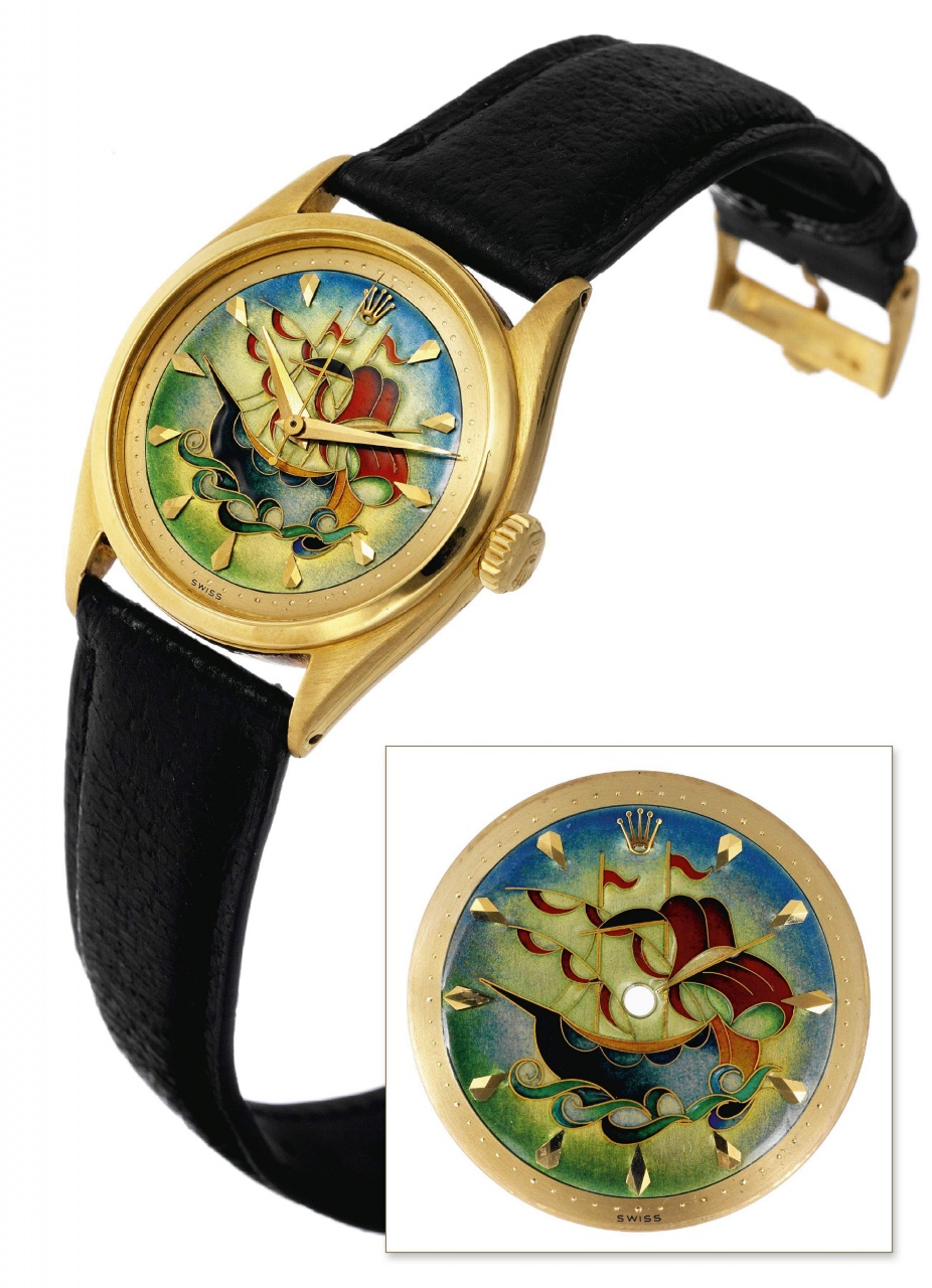 Ну, и , наконец, можно сказать, произведение искусства. Возможно, самый первый ролекс с эмалевым циферблатом, выполненным в технике cloisonne. Часы имеют двойной референс 5029/5028, были произведены в 1949 году в необычно большом для того времени размере 36 мм. Рисунок на циферблате был выполнен мастером Маргарет Кох и никогда не подвергался реставрации.