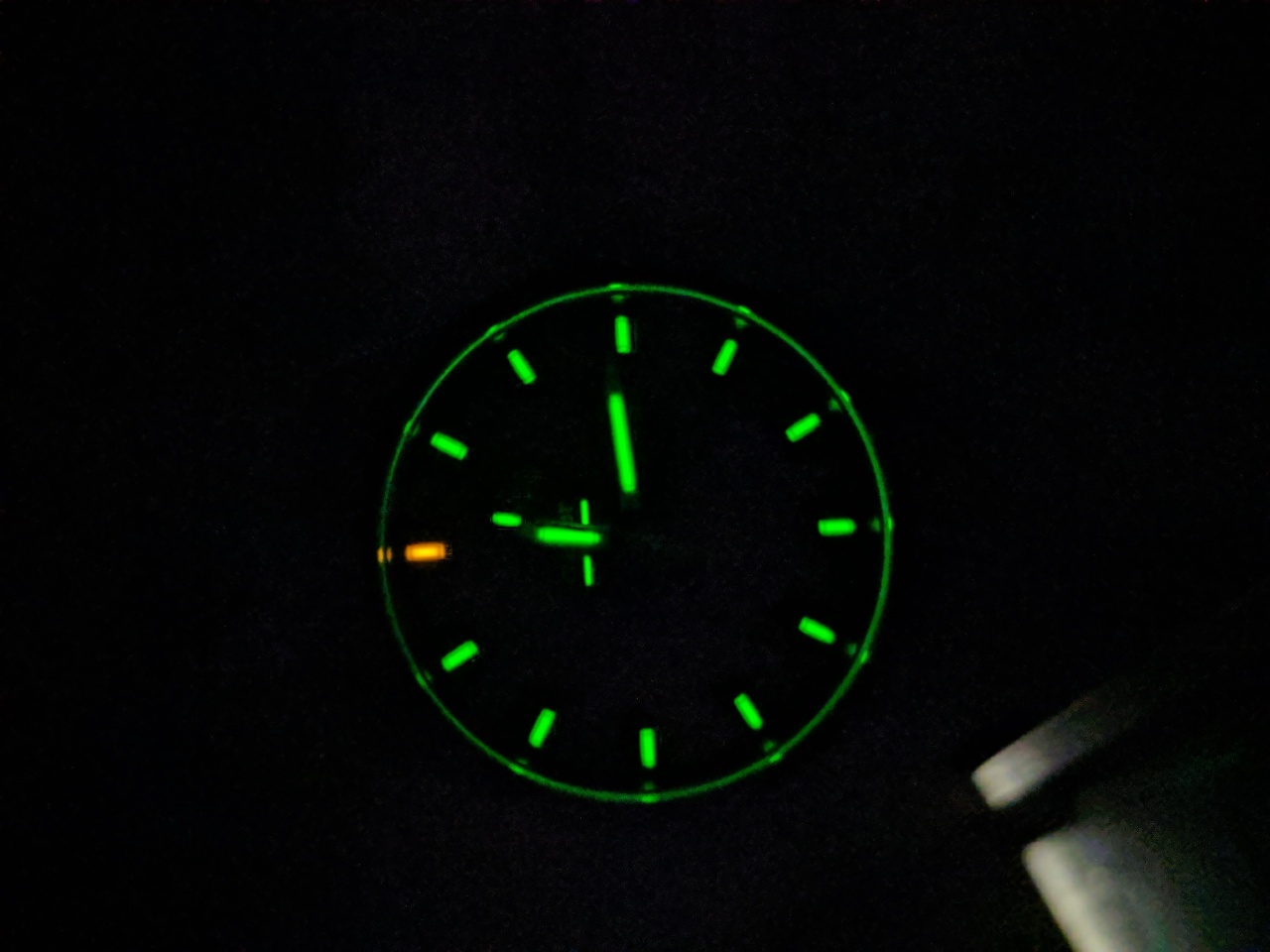То, что мне нравится в часах. Тритиевая подсветка! Это мои первые часы с тритиевой подсветкой, и она мне очень нравится. Ночью светит очень красиво, особенно сочетания зелёных и оранжевой метки. Единственное, что считаю лишним- это две колбочки под надписью traser. Они для меня лишние, только мешаются. Сделано ли это для того, чтобы лучше было различать, где у часов верх, а где низ? Может быть, но на 12 часах стоит оранжевая колбочка. Для дальтоников? Я бы тогда предпочёл две колбочки на 12 часах и одиночные на 3, 6 и 9.