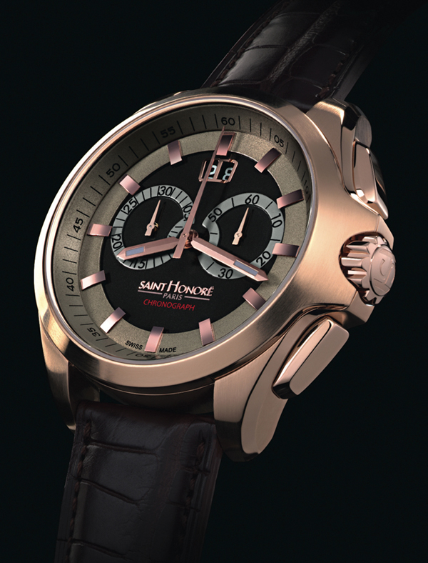 Обтекаемый 44 миллиметровый корпус спортивного хронографа Coloseo Gents от Saint Honore выполнен из18К розового золота. Надо сказать, что внешний вид часов несколько непривычен: основные визуальные характеристики – это глубина и объём. Причем, глубина получена за счет безеля, на внутреннюю сторону которого нанесена минутная разметка. Для стрелок и индексов часа удачно используются накладные пластины 18К розового золота (обладая определённой толщиной, они неплохо передают объем). На циферблате – часы, минуты, секунды, хронограф: 30-минутный и 60-секундный счетчики, окошко даты. Достойный функционал, современный внешний вид, удобная эргономика – Coloseo Gents – оптимальный мужской хронограф для жителя мегаполиса. Циферблат часов защищает выпуклое сапфировое стекло. Водонепроницаемость – 50 м. Механизм кварцевый. Кожаный ремешок с защёлкивающимся замком.