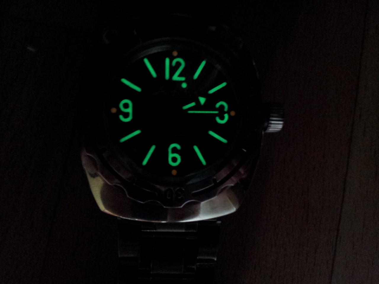 Благодаря Стасу, часы приобрели совершенно другой вид. Теперь это действительно универсальные, красивые часы. Люм светится прекрасно, не хуже, чем на моих пилотских немцах. К сожалению, фотографировать в темноте я не умею. Кстати, на Амфибии, он сделал мне точки над цифрами оранжевого цвета. Выглядит очень здорово, в сочетании с салатовыми цифрами, метками и стрелками.