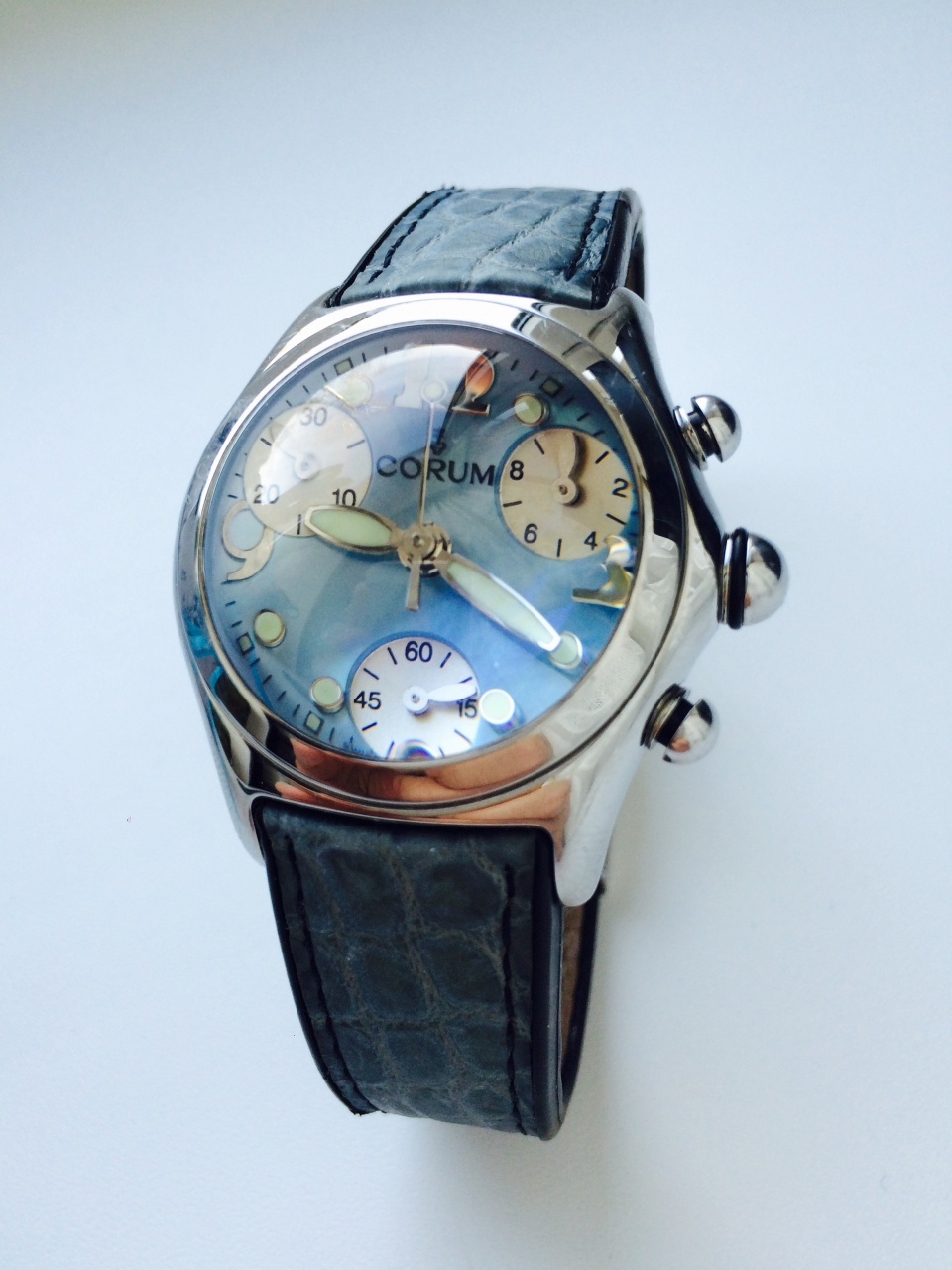 Ярко святящиеся в темноте метки. Небесно-голубоватый перламутровый циферблат, в его цвет кроко ремешок.