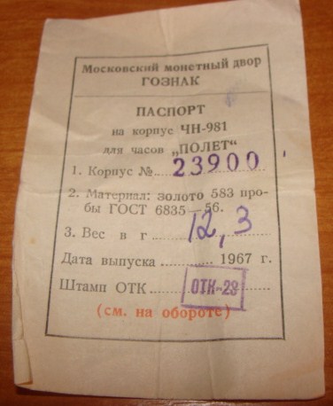 Паспорт от золотых Полет 1967 год