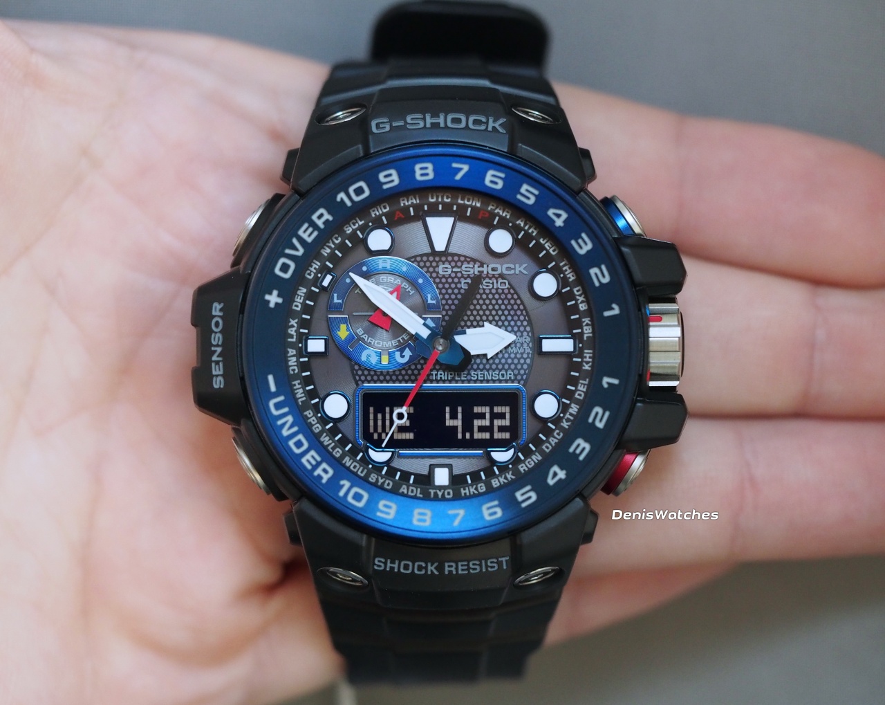 Это первая модель из серии G-Shock, у которой есть комбинированный дисплей и тройной сенсор, т.е. присутствуют барометр, термометр и компас.