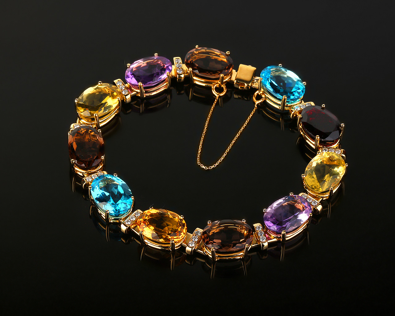 Представляем вашему вниманию коктейльный золотой браслет с бриллиантами 0.5ct и крупными цветными камнями 60.5ct.