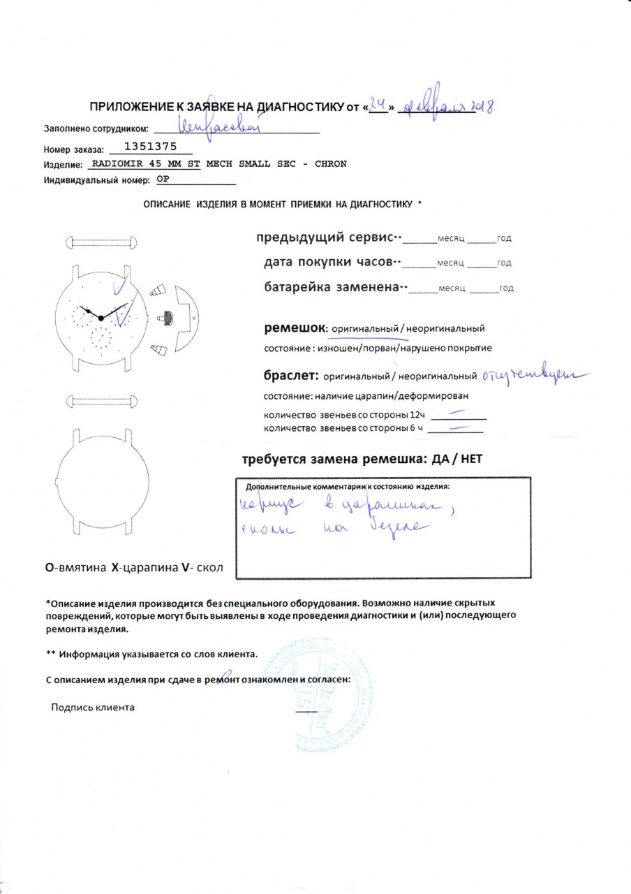 Сотрудник бутика, никуда не торопясь, внимательно осмотрела мои часы. Никаких повреждений, кроме естественных следов на корпусе от ежедневного ношения на работу, не нашла. Сотрудник бутика всё отметила в приложении к заявке на диагностику (см. Pic1, Pic2).