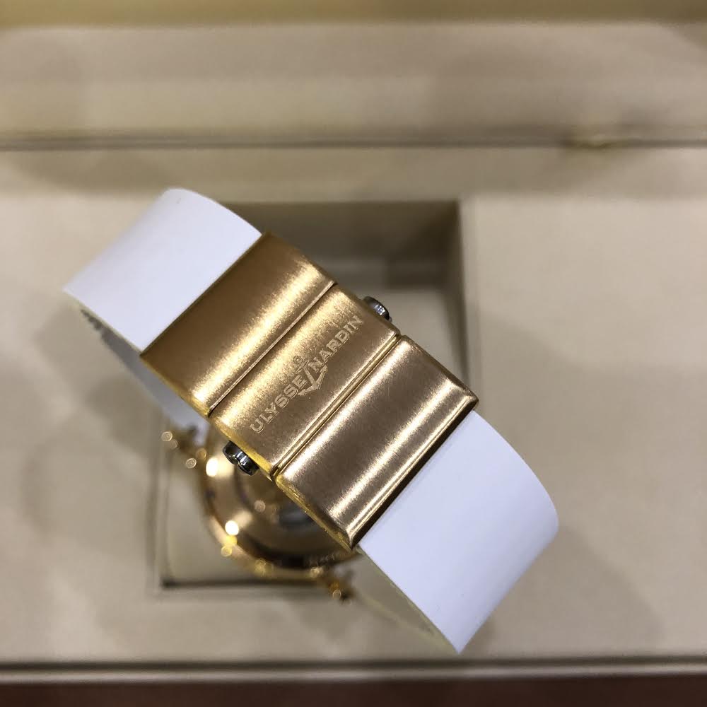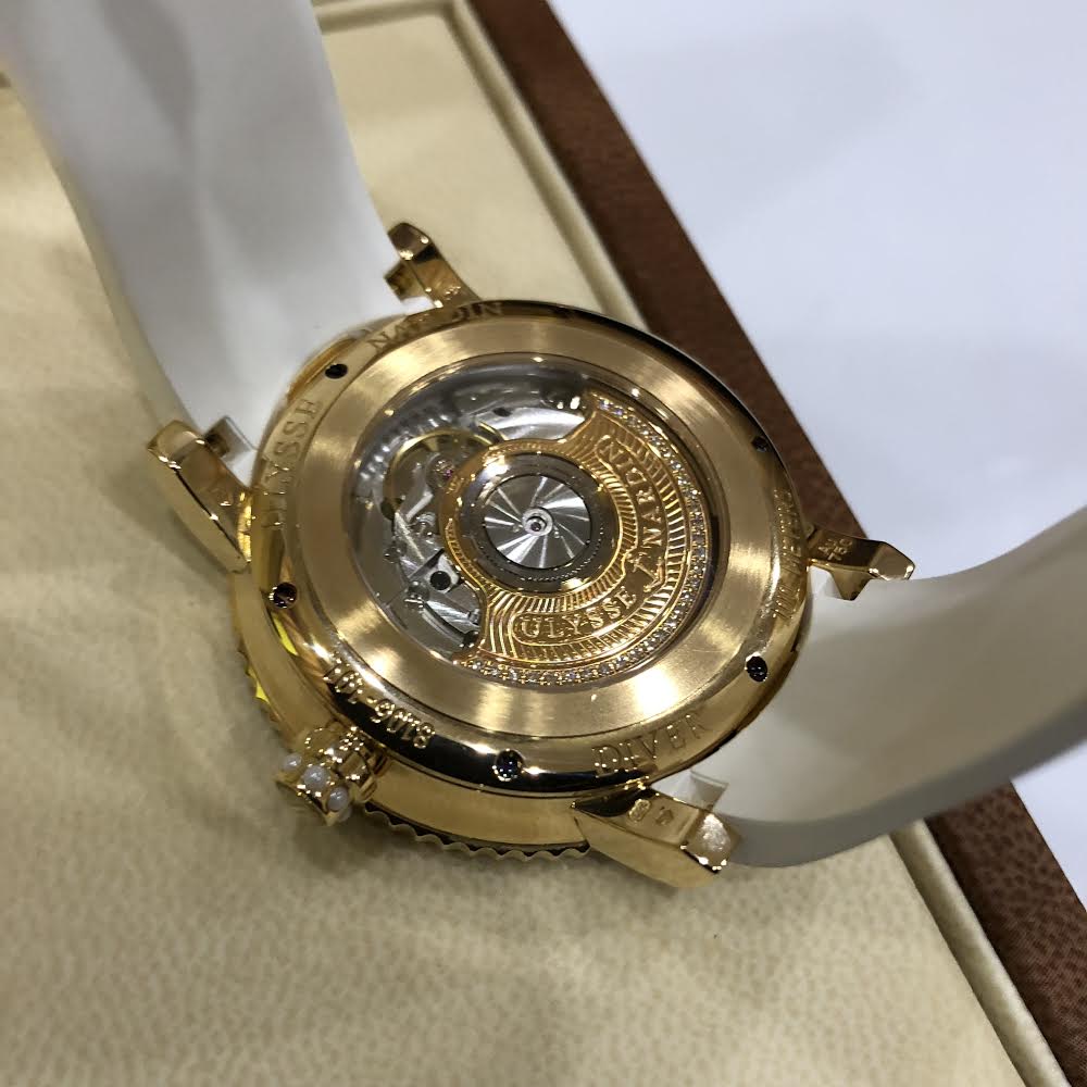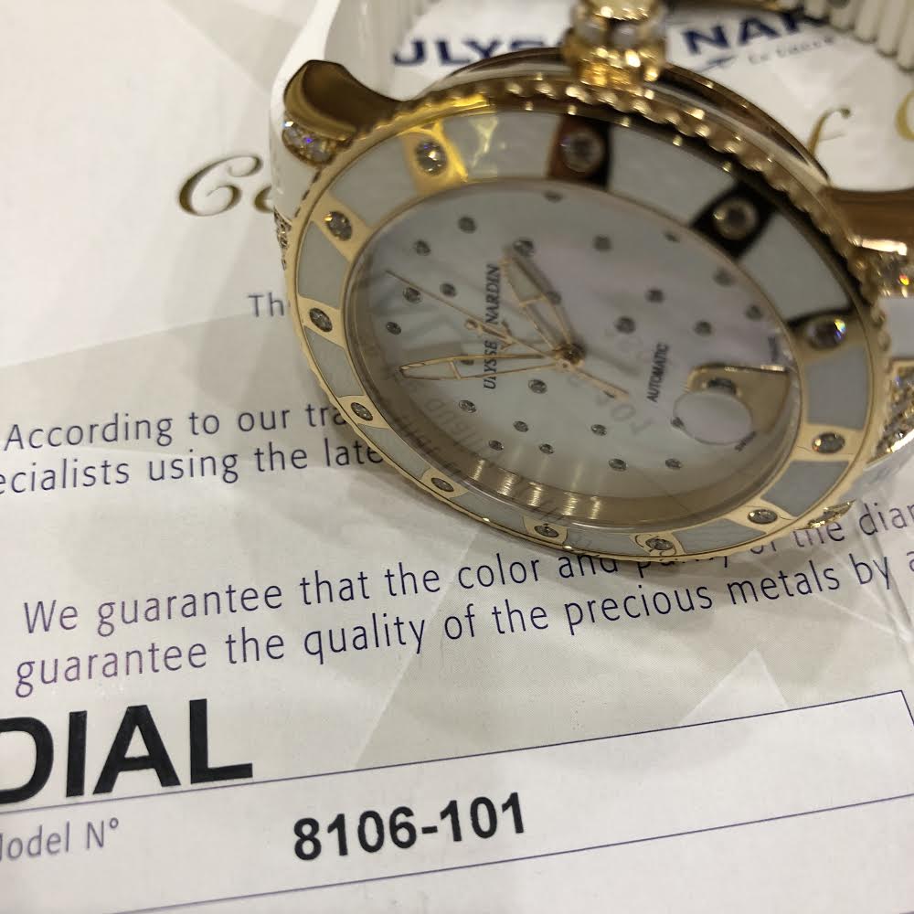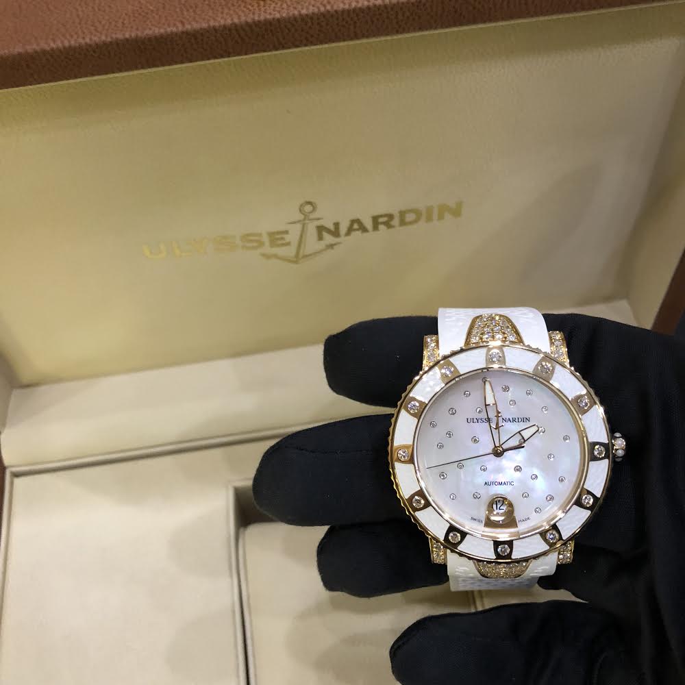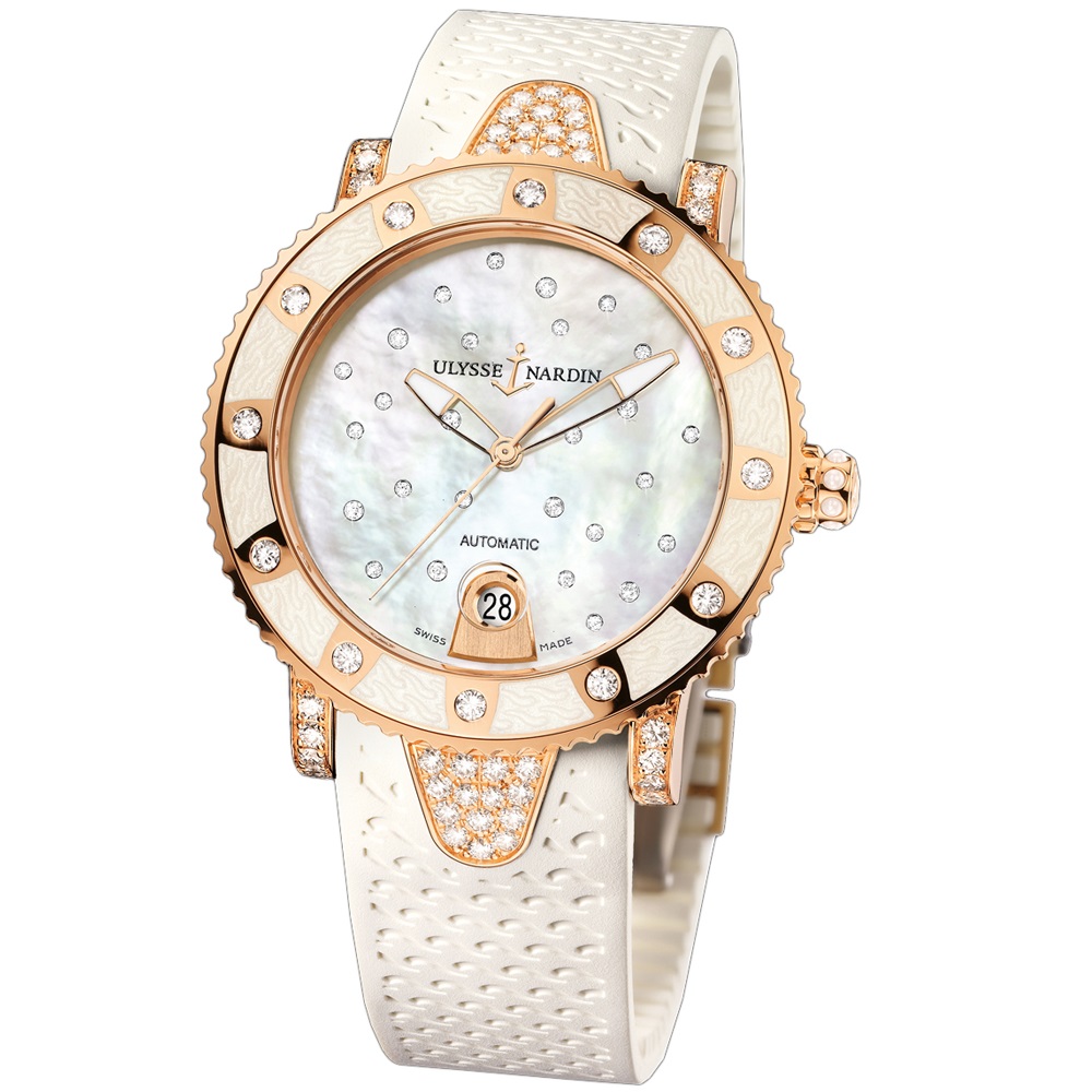 Великолепные часы от мануфактуры Ulysse Nardin Lady Diver Starry Night 8106-101E-3C/20 – это идеальное сочетание безупречного дизайна, элегантности и практичности. Модель часов Ulysse Nardin Lady Diver 8106-101E, превосходно сочетающая высокое качество и стиль, одинаково хорошо подходит для деловой обстановки, светского приема и отдыха. Когда наступает вечер, и луна восходит на далеком небосводе, сверкающие звезды спускаются на изящное женское запястье и часы Lady Diver Starry Night превращаются в изысканное украшение. Часы собраны вручную, 40-миллиметровый корпус выполнен из стали и украшен белыми бриллиантами. Перламутровый циферблат инкрустирован 27 камнями, 12 бриллиантов украшают безель Общее количество бриллиантов - 87, общим весом - 1,85 карат Top Wesselton, VVS, что подтверждается сертификатами. Механизм часов UN Lady Diver автоматический, калибр UN-810 виден сквозь прозрачную сапфировую заднюю крышку корпуса. Часы дополнены белым каучуковым ремешком и золотой раскладывающейся застёжкой и являются герметичными на глубине до 100 метров.