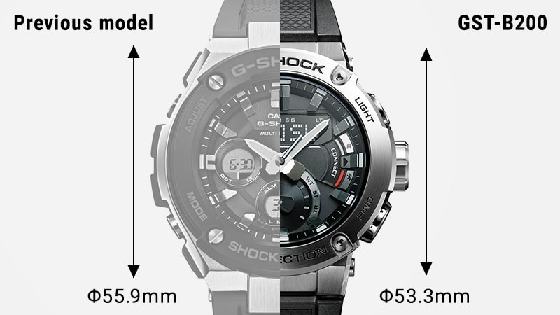 Корпус и правда стал компактнее — 53.3 x 49.2 x 14.5 мм по сравнению с предыдущими G-Steel GST-W300 [там 55,9 x 49,3 x 15,3], хотя логичнее было бы сравнивать с GST-B100 [58,1x 53,8x 14,1], которые более близки к 200-м как по “духу”, так и по ценовой категории. Несмотря на уменьшение корпуса, циферблат теперь на 2,5 мм выше, нежели у тех же GST-W300, а значит появилось еще больше полезного пространства для индикации функций часов......"