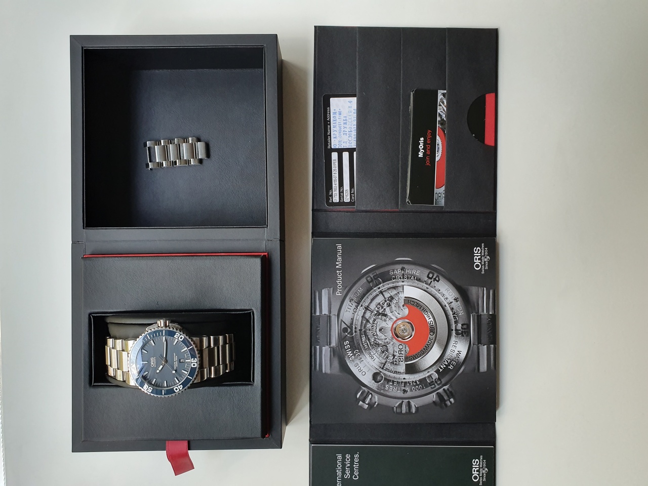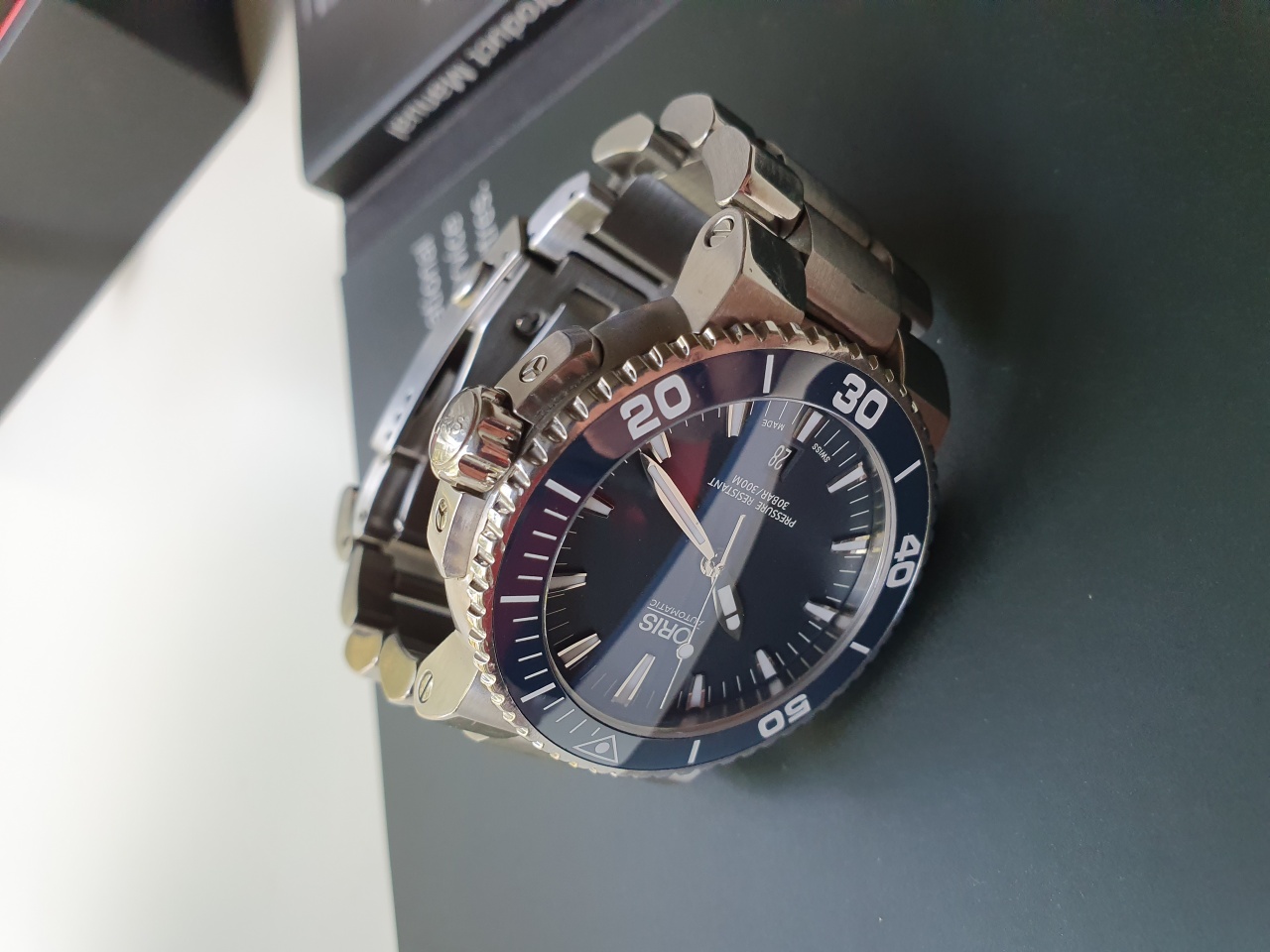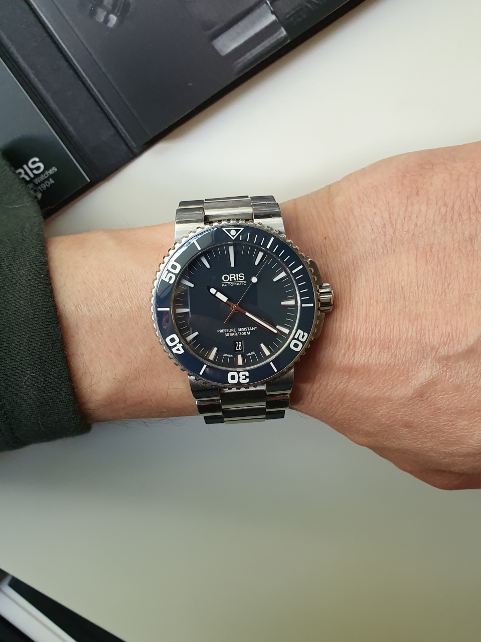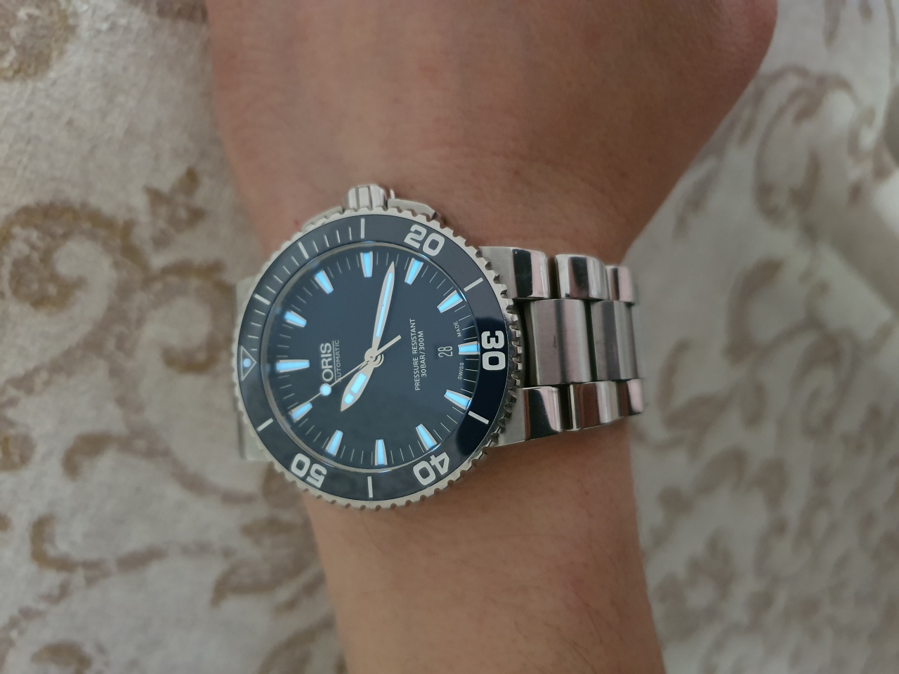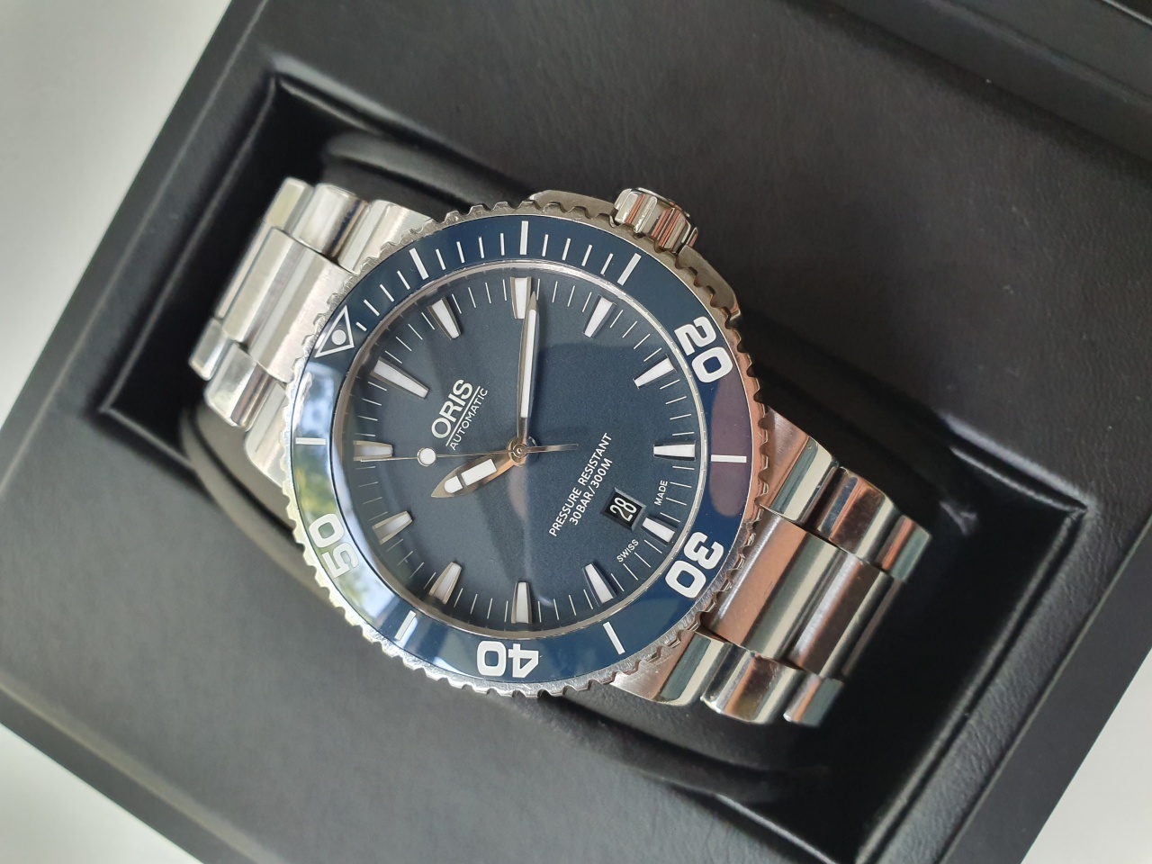Oris Automatic с синим безелем и циферблатом, диаметр 43 мм, дайверская стальная модель не уступающая по красоте более дорогим собратьям этого вида, тем же Omega Seamaster. Модель сейчас называется Oris Aquis и стоит в бутике от 130 тыс рублей. Часы покупал в 2013 году у оф дилера в Москве, носил нерегулярно, так как у меня в коллекции 6 разных моделей часов. С 2016 года ушел с работы, требующей дорогих аксессуаров, часы лежат в коробке, достаю три четыре раза за год для важных встреч. Состояние часов на 4+, часы полностью исправные, на корпусе и браслете нет заметных царапин. Причина продажи - предстоит большая покупка, собираю средства . Часы не обслуживались, нареканий к точности хода нет. Комплект продажи: часы, паспорт, инструкция и коробки, запасные звенья для расширения браслета. Передам покупателю в Москве или отправлю через гарантированный сервис для расчетов типа наложка.рф. Спешки в продаже нет, торг возможен разумный. Обмен не интересует.