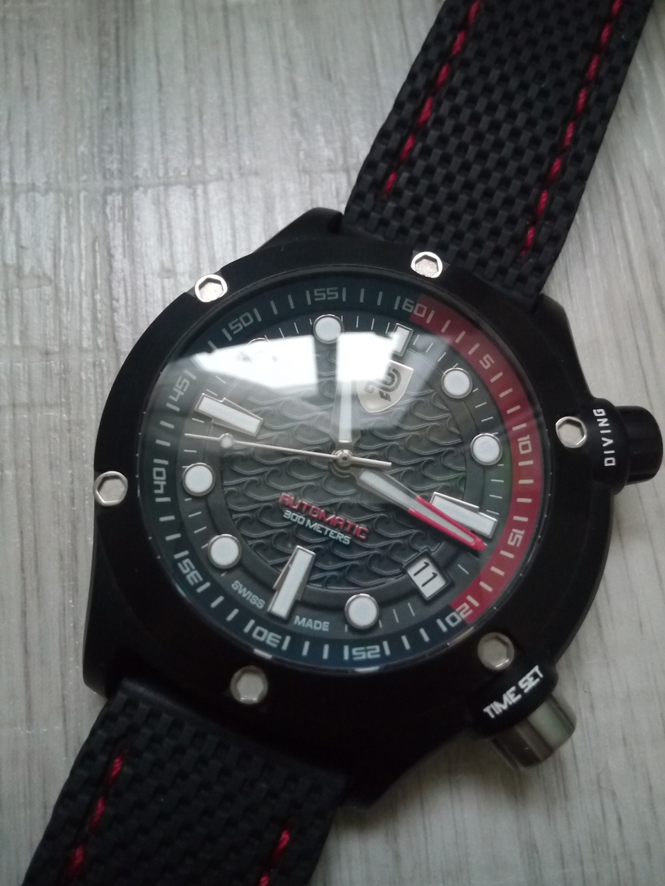 Циферблат: черный с 3D эффектом волн, очень красиво смотрится, накладные метки, дата на 4 часа, внутренний дайверский безель, управляемый головкой на 2 часа, ЗГ на 4 часа, обе головки завинчиваются.