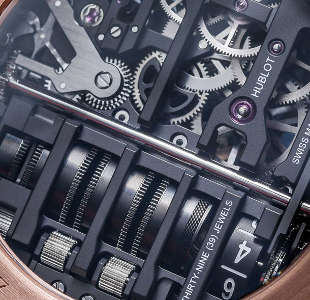 Баланс перемещен в сторону циферблата, чтобы создать симметрию с винтовой зубчатой передачей. Кремниевый спуск обеспечивает балансовую частоту 4 Гц с помощью причудливой запатентованной системы сборки индексов с интегрированным в нее «H» Hublot.