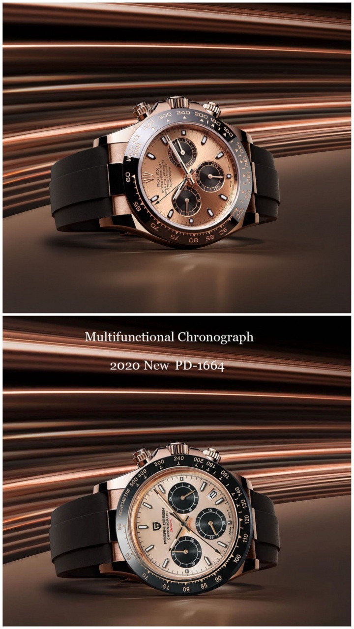 На заводной головке не гравировка, а довольно посредственное литье. Повторяют оригинал. Безель првернут слега влево - не совпадают индексы и метки безеля. Но это, как я понял, у всех дайтон пд. Ремешок толстый, похоже, что без напыления. Бакля тоостая, литая, с лого и разными методами обработки поверхности. У цифра цвет не чистый металлик, а чуть отдает в красноватый оттенок, как мне кажется. Читаемость плохая у данного типа - блестящие стрелки и цифер сливаются. Люм никакой, даже хуже обычнлго. В остальном - конфетка.