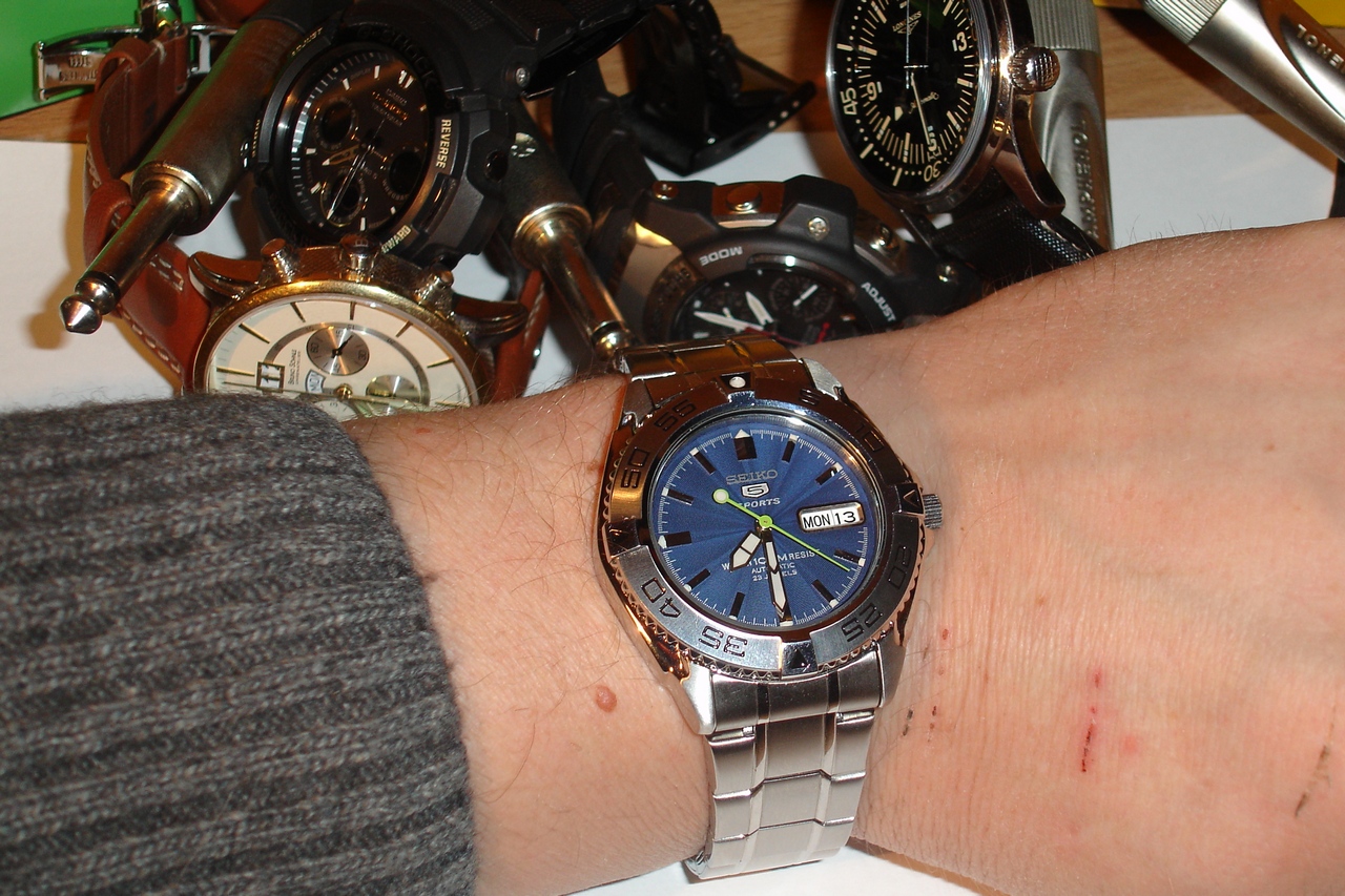 Вот задавила меня гордость и радость. Не могу не выплеснуть на голову коллегам по увлечению. Это к тому, что как человек обстоятельный на достигнутом не остановлюсь. Буду черпать из "кладезя мудрости" и постигать непостижимое. Потихоньку совершенствуясь по пути. Не зря здесь тема про часы "восточного часопрома". А как говорят на востоке? Правильно - главное не результат а путь к нему. Утомлённые тусклым и печальным светом заходящего солнца (немец и швис), глаза мои обратились к радостному свету востока (восхода по простему ). Очень знаковое и нужное знакомство с продукцией фирмы Касио подсказала дальнейшее направление движения. Отпали хотелки на бюджетных швисов и было принято решение. Настоящая мануфактура. И опять правильно - это Сейко. Первое знакомство - Сейко 5. Только положительные эмоции. Я как чел весьма любопытный и общительный перелапал огроменную кучу часов разных цен. Вроде как знаю шо такое - "цимес" . К сожалению Сеек, кроме как у сомнительных торговцев, вроде настоящих но лежащих между "вашеронами" и "патеками" у руки брать брезговал. Может и зря. Но нашёлся человек, который (даже модель скажу - нео монстр) заронил в душу зерно. Смутил размер, но с помощью пытливого ума, в муках родился ответ - та не все же такие. И вот моя первая (ну не первая, лет 30 назад носил), надеюсь не последняя Сеечка - на руке. Толчком к написанию отдельной темы послужил ещё тот факт, что помучавшись с "мыльницей" и добравшись до ручных настроек получилось сделать более менее аутентичное фото. Даже гильош виден. Вам смешно, а я его без очков не рассмотрю. В общем принимайте, и советуйте побольше - у меня часы - минимум парами ходят ...
