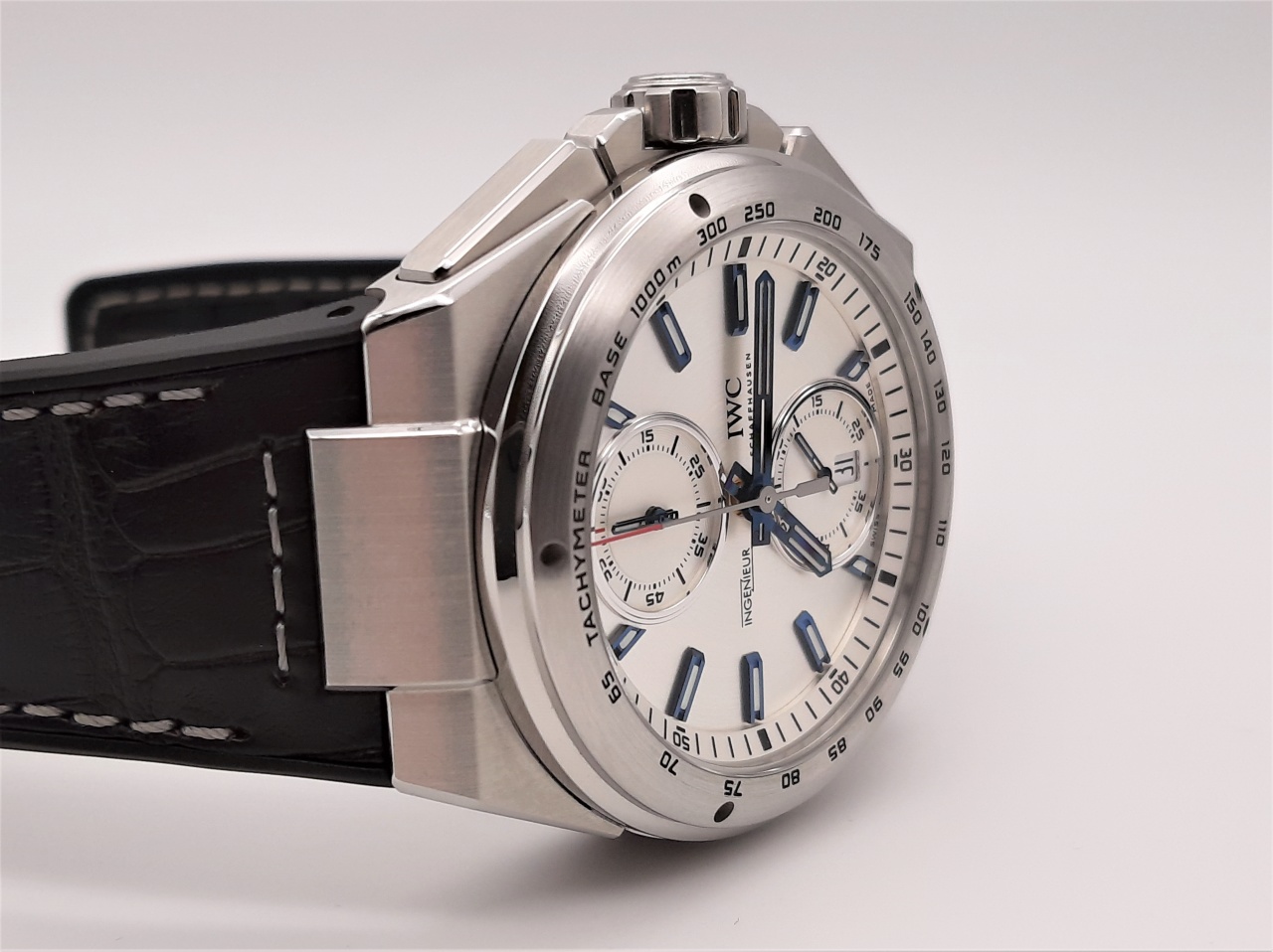 Модель посвящена партнерству IWC Schaffhausen с гоночной командой MERCEDES AMG PETRONAS Formula One™. Ingenieur Chronograph Racer - это надежный измерительный инструмент, оснащенный одним из самых эффективных механизмов IWC – калибром 89361. Счетчик хронографа в положении 12 часов позволяет считывать часы и минуты, а при помощи центральной секундной стрелки со стоп-функцией можно замерять временные отрезки продолжительностью до одной минуты и скорость на заданной дистанции при использовании совместно с тахиметрической шкалой. Кнопка сброса счетчиков хронографа позволяет одним нажатием обнулить текущее измерение и начать новое (функция flyback).