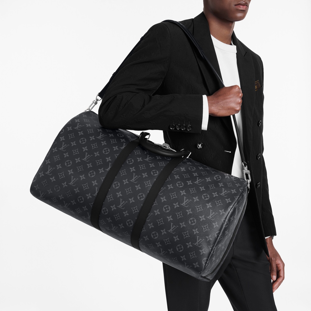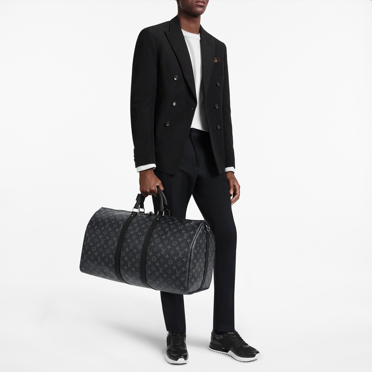 "Полюбившаяся многим модель Keepall 55 с плечевым ремнем выполнена из новой канвы Monogram Eclipse черно-серого цвета. Легкая и мягкая сумка готова немедленно отправиться в путешествие и полностью оправдывает свое название: эксперты искусства упаковки смогут легко сложить во вместительную сумку Keepall 55 (которая соответствует нормам размеров ручной клади) гардероб на неделю."