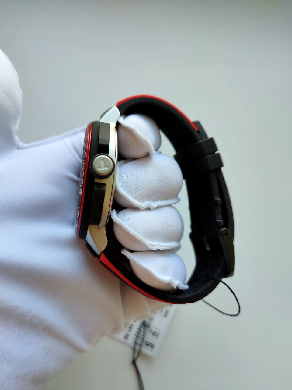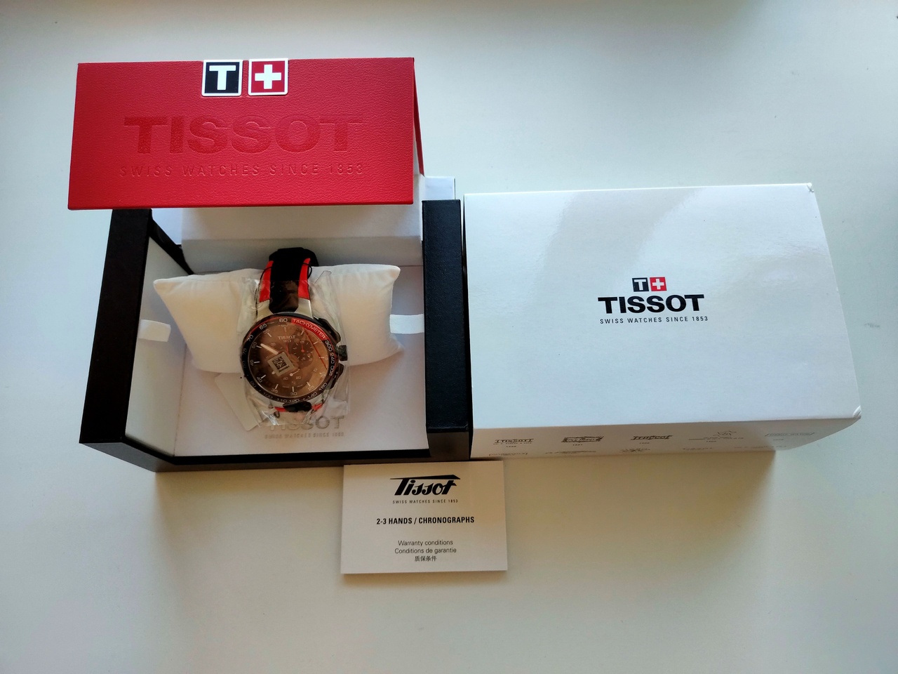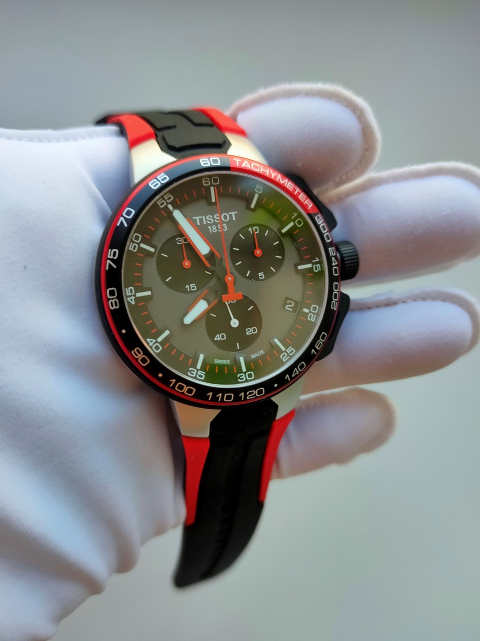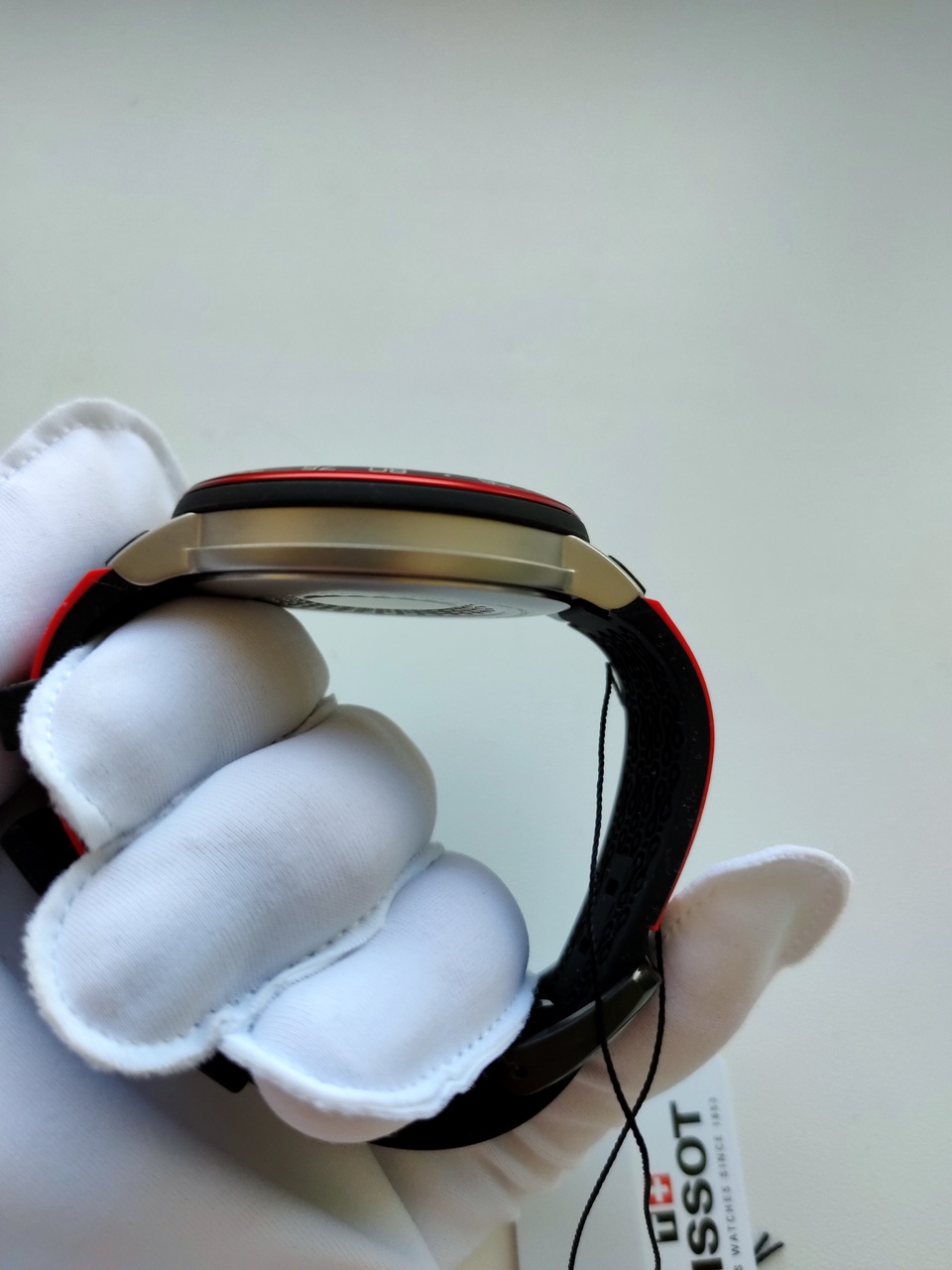 В продаже отличная модель хронографа от Tissot на дорогом кварцевом калибре, посвященная любителям велоспорта. Солидный мужской размер корпуса, отличный мягкий силиконовый ремещок, дизайн грамотно разбавленный акцентами красного. Интересное оформление заводной головки и пушеров хронографа. Задняя крышка декорирована гравировкой в виде системы ведущих звезд велосипеда