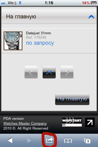 Мобильная версия watches-master.net легко может быть добавлена в закладки вашего коммуникатора, что позволяет в следующий раз очень быстро вызвать каталог. Иконку закладки можно разместить на рабочем столе, что позволить сократить доступ к ресурсу до одного клика.