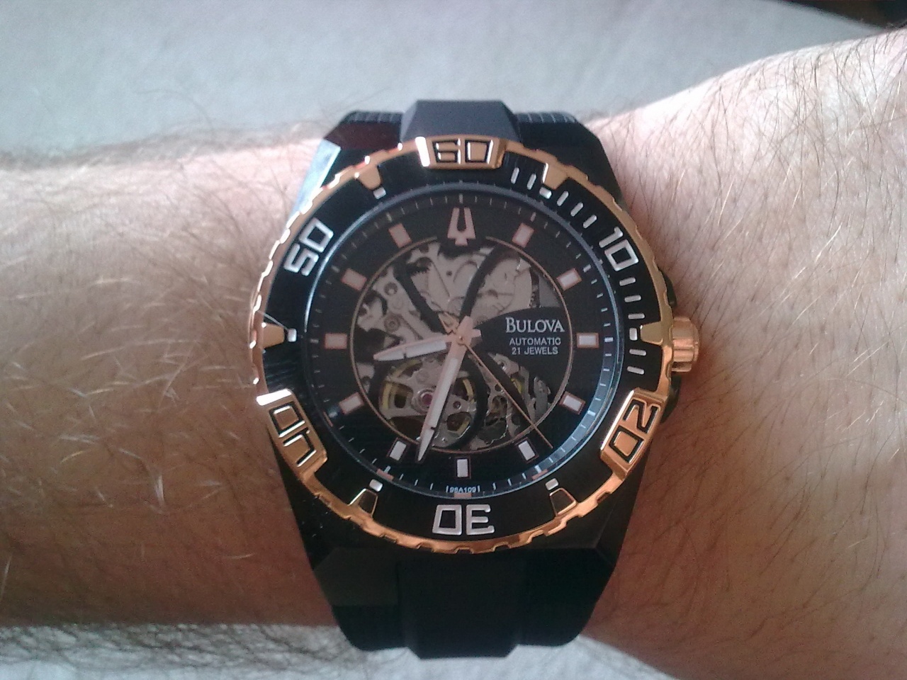 Из ощущений: отделка корпуса и ремешка - супер (не ожидал что каучуковый ремешок сразу так хорошо подойдет к запястью), на руке чувствуется некоторый вес (но приятный). Приятно также наблюдать работу открытого механизма.