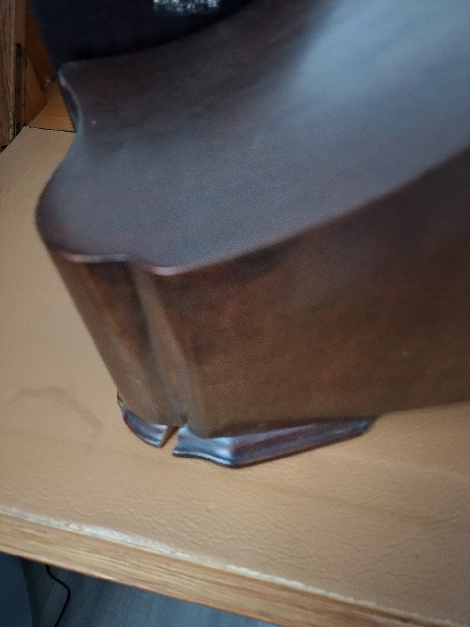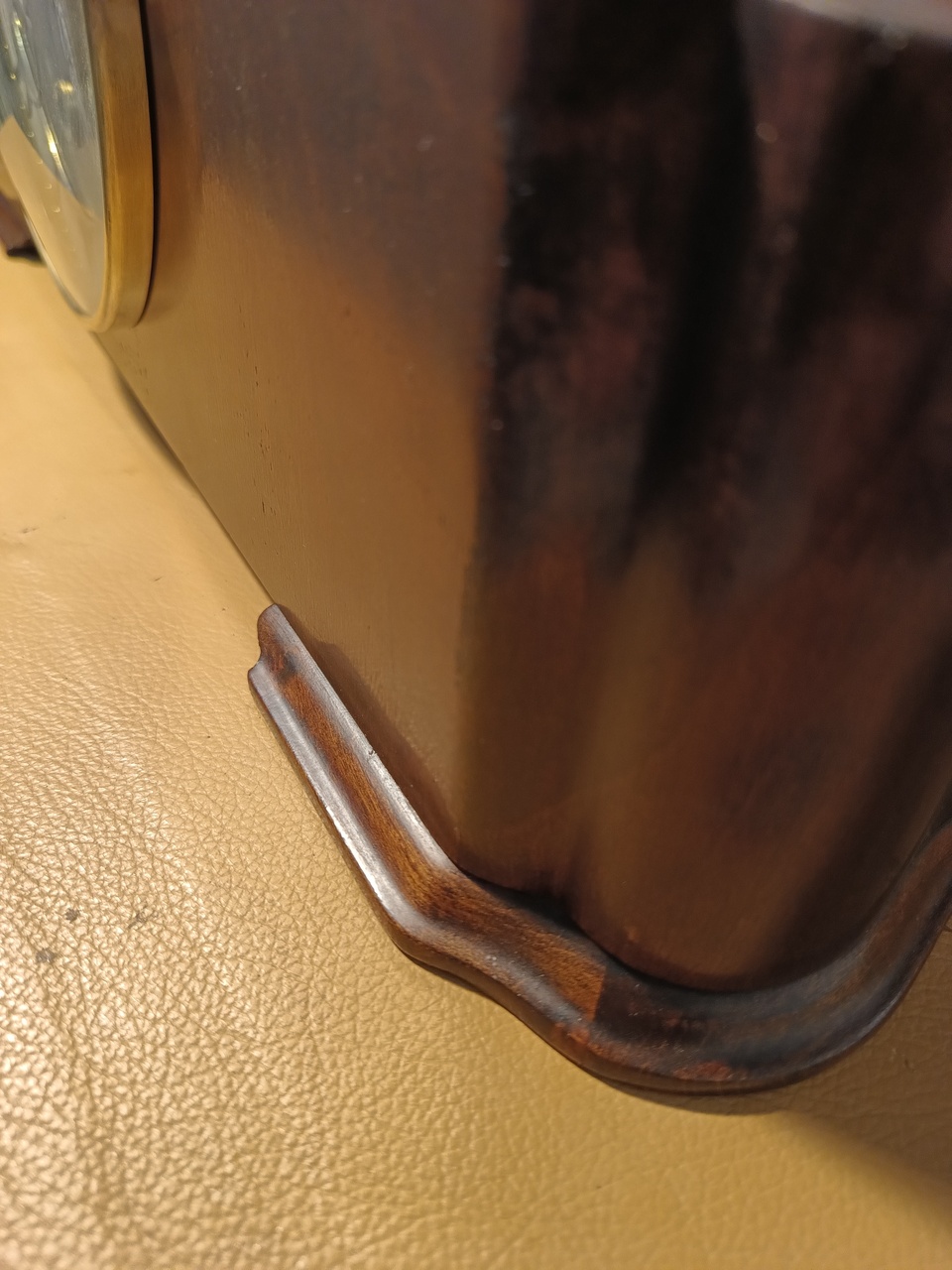 Когда корпус стал похож на часы, приклеил ножки и прибил гвоздиками. По всему корпусу прошел мебельным воском. Подождал мин 30-40 и куском махрового полотенца придал блеск. Мне очень понравилось то что получилось. Шлифовка и морилка скрыли потери лака, а воск придал корпусу благородный блеск.