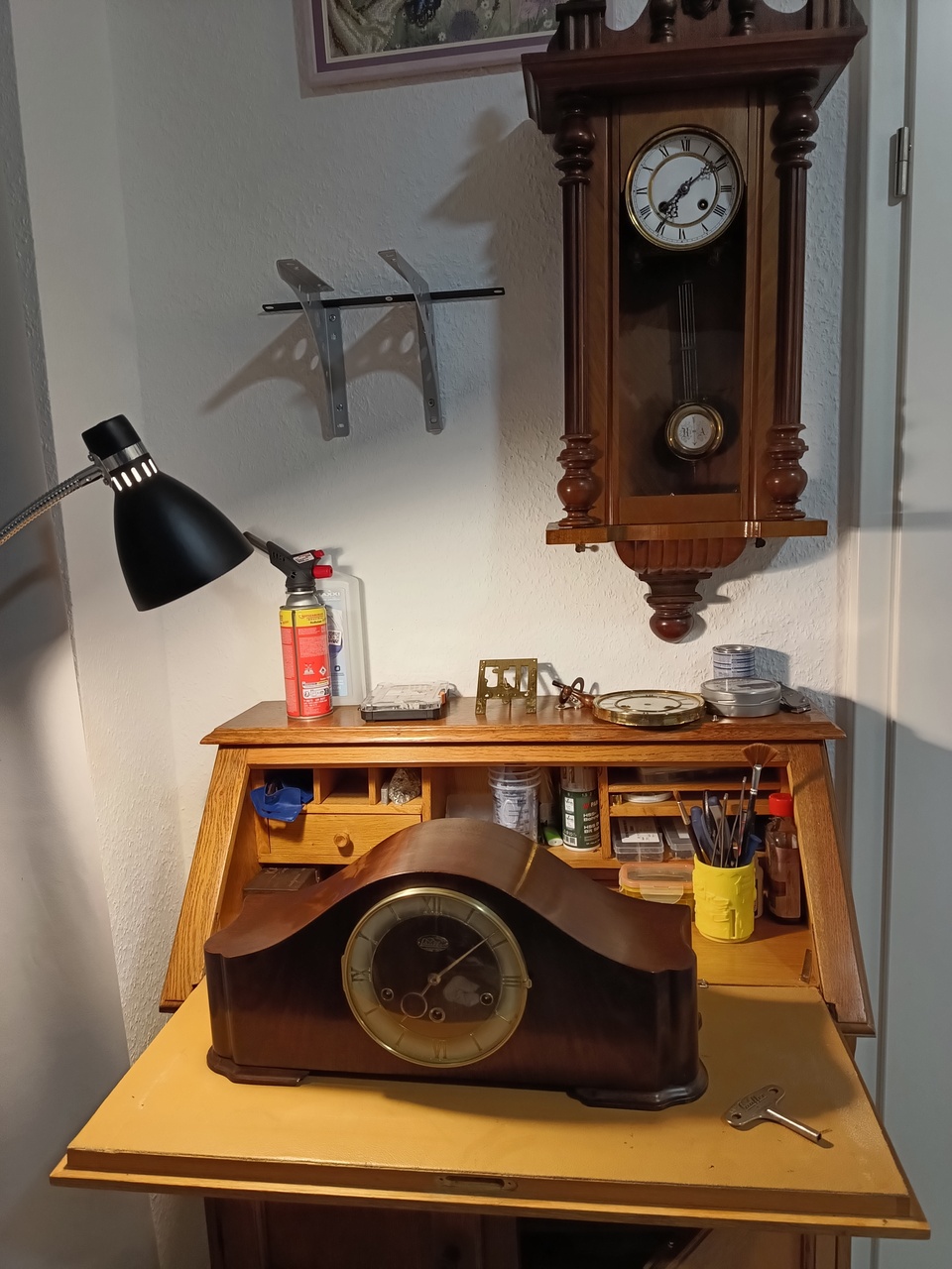 Karl Lauffer настольный\каминный\буфетный. Четвертные. Годом выпуска не интересовался. Скорее всего после 49, когда фирма открылась во второй раз после Второй мировой. Интересный механизм, на толстенных платах, около 2.5-3 мм толщиной. Кстати платины имеют клеймения на торцах.