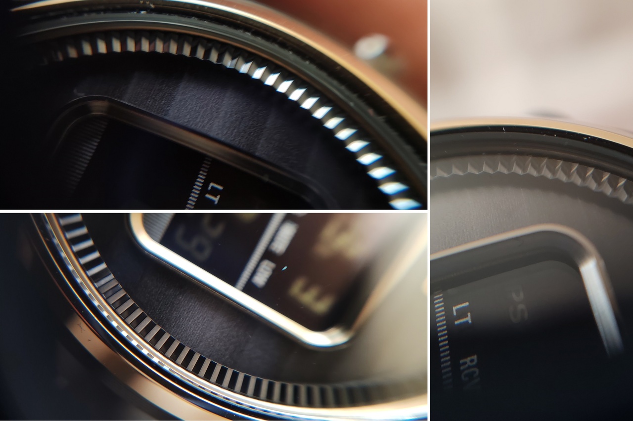 Качество исполнения часов очень и очень достойное, как и уровень работы дизайнеров. Корпус полированный в круг, но учитывая IP-покрытие, может, царапин будет и не очень много. Верхняя панель кажется матовой, а на самом деле покрыта очень мелким концентрическим круговым узором.