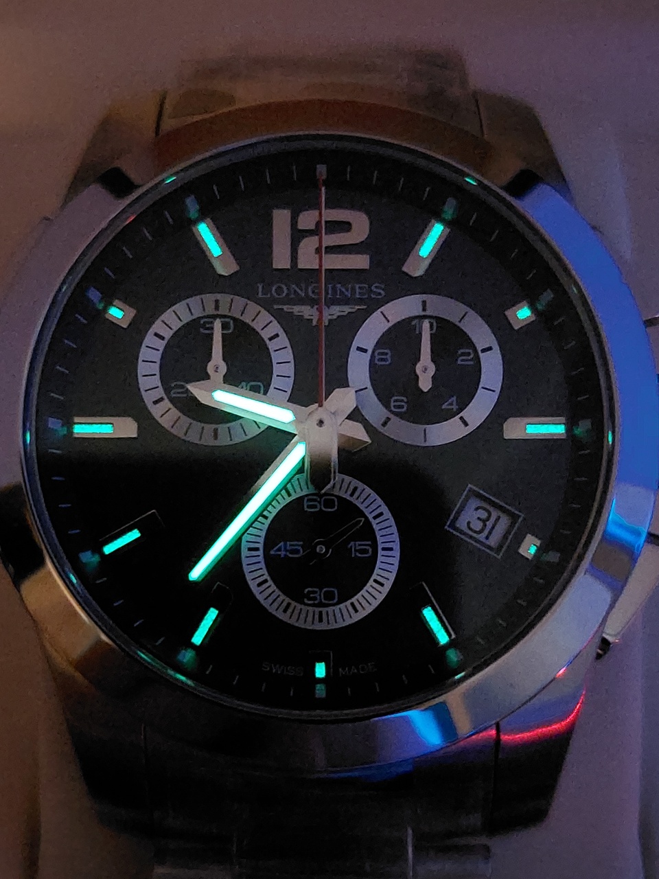 На циферблате помимо этого размещены три дополнительных циферблата хронографа, от 0 до 10 показывает десятые доли секунды счетчик-на отметке 2-х часов, 30-ти минутный счётчик-на отметке 10-ти часов и 60-ти секундный счётчик-на отметке 6-ти часов.