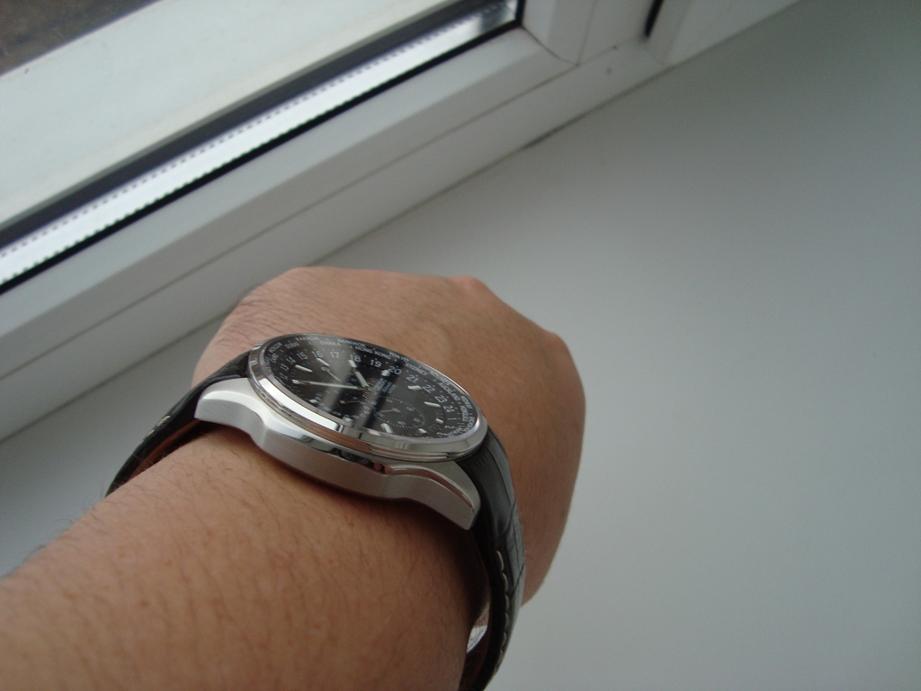 о самих часах. В часах стоит механизм 46H (EY); 23 камня; автоподзавод (ручного подзавода и стоп-секунды нет); плоское сапфировое стекло (какое стекло на задней крышке не знаю); водозащита 100 метров; точность хода, заявленная производителем +25/-15 сек/сутки. Функции - отображение часов, минут, секунд, дата, индикатор запаса хода, мировое время GMT в 24 часовых поясах (по городам). Кожаный глянцевый ремешок чёрного цвета, стилизованный под кожу крокодила. Застёжка "бабочка", что очень удобно.
