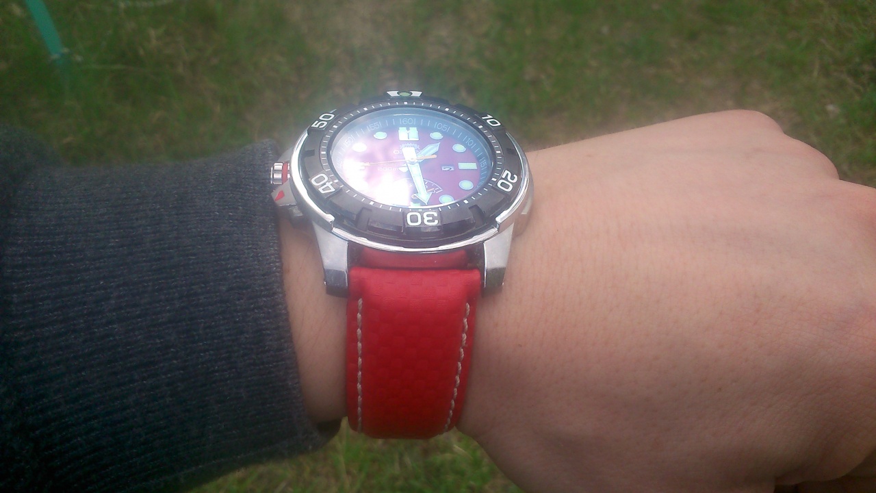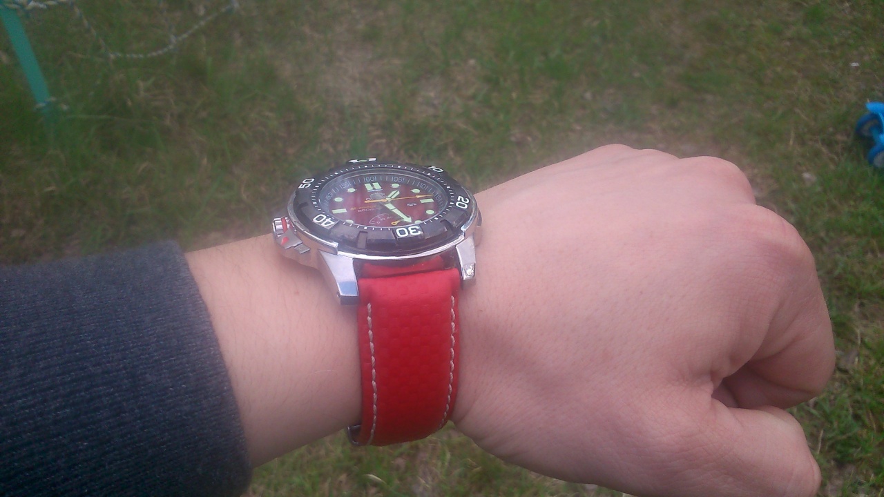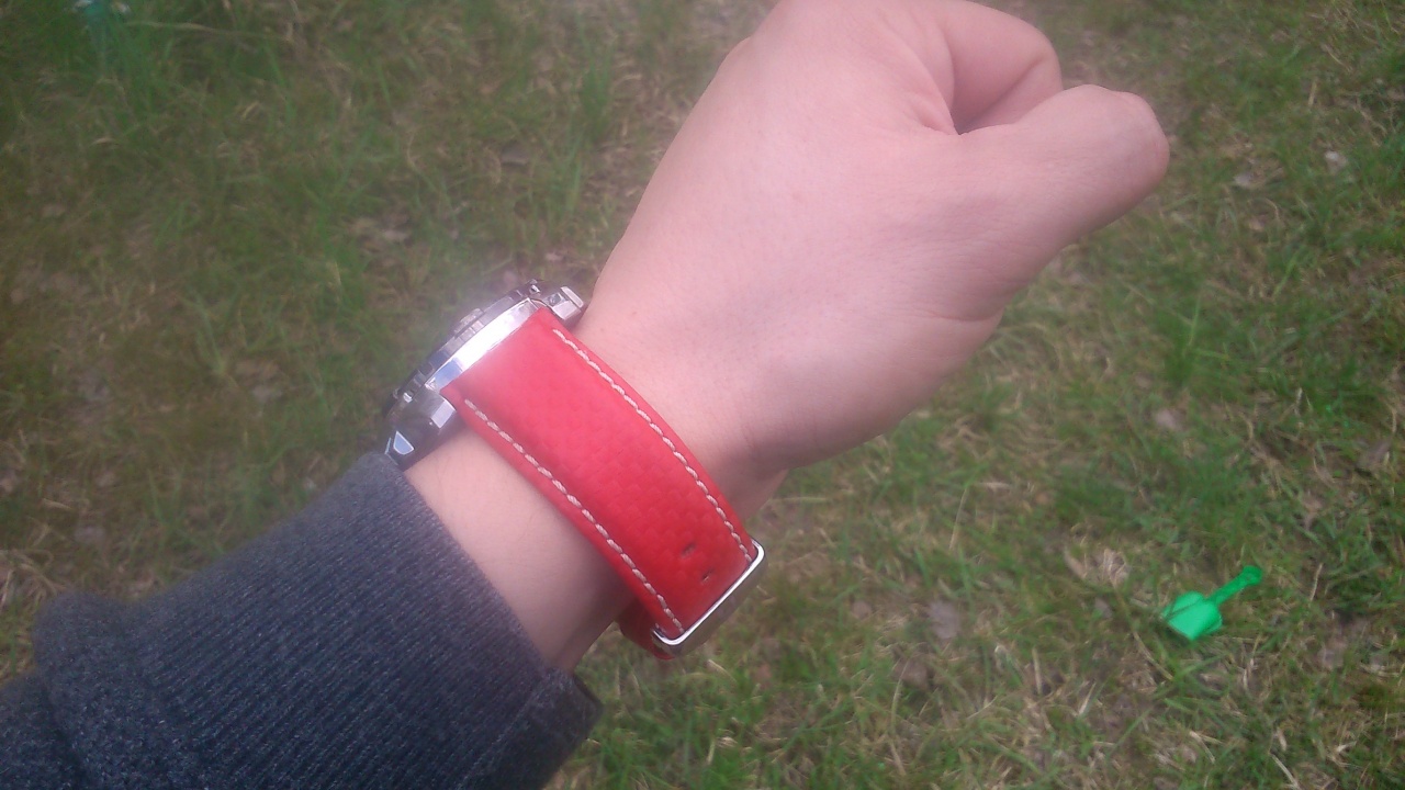 Один под цвет цифера, кожа исполненная под карбон, с внутренней стороны ремня каучук. Сам ремень водостойкий, имеет WR 100, можно плавать. Его пересадил на клипсу, которую тоже специально брал к этому ремню, но оказалось что сам ремень очень жесткий, приходится носить сильно ослабленным, иначе клипса запястье сильно натирает. А носишь в расслабленном состоянии, постоянно сползают сами часы из-за своего веса, приходится поправлять, что тоже неудобно. Вообщем затянешь-запястье режет, ослабишь-часы сползают.