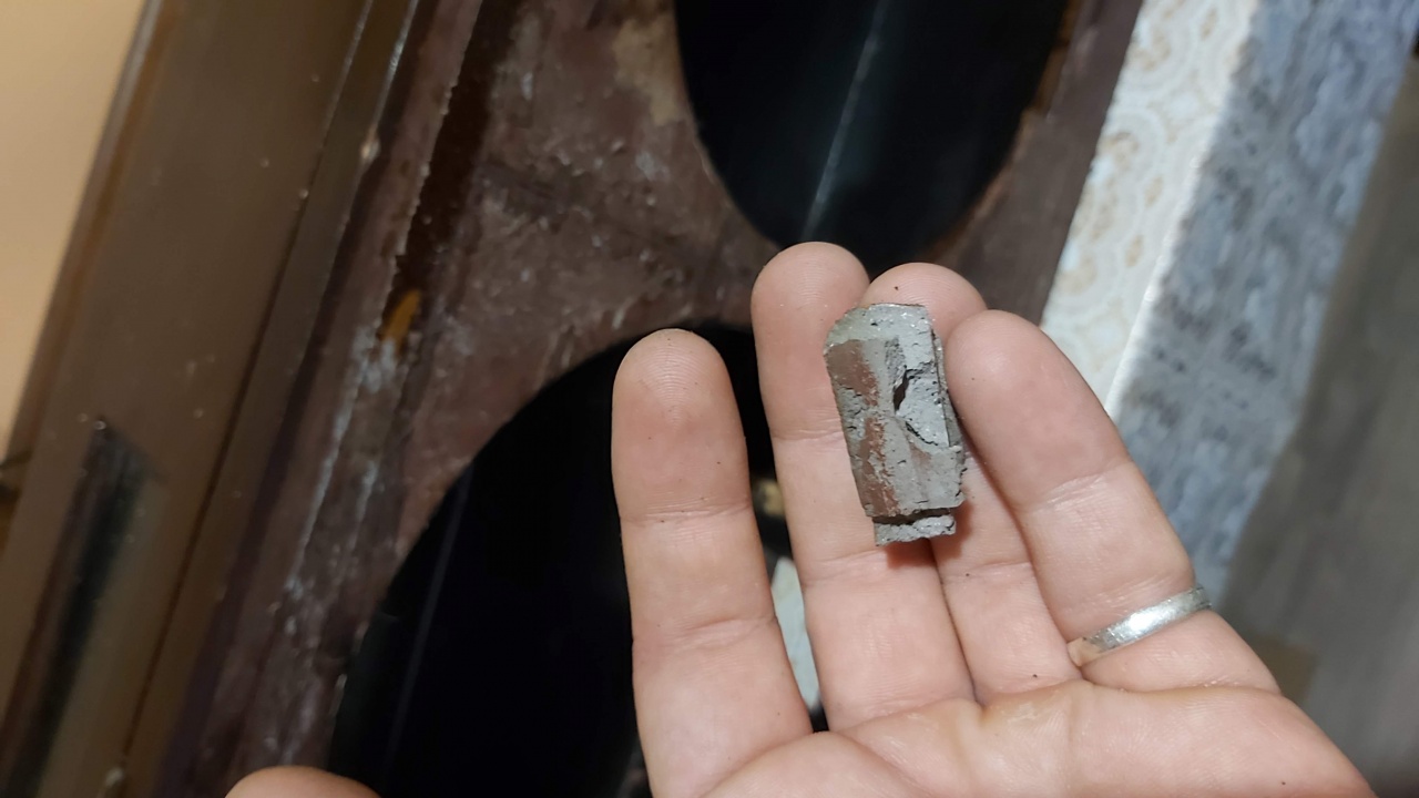 4. Далее корпус был полностью покрыт шпаклевкой на основе цемента или чего то такого. Полагаю уже лет 100 назад был так обработан. Неровности сборки были так же компенсированы очень болььшими кусками цемента. И покрашен.