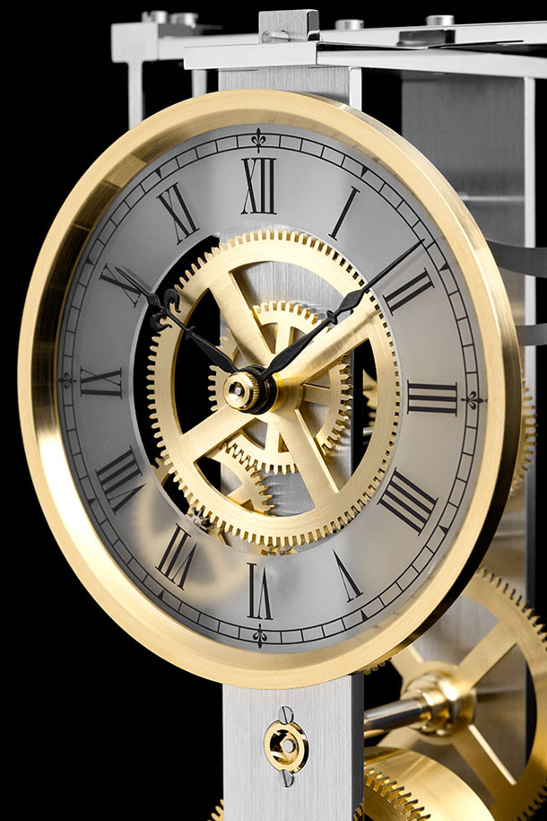 Между основанием и циферблатом находится заводной барабан, оснащенный пружиной длиной 4,1 м, благодаря которой механизм располагает 8-дневным запасом хода. Для завода часов необходимо повернуть квадратный элемент заводного вала при помощи ключа. При этом храповое устройство и пружина размещаются над центральной частью заводного барабана во избежание раскручивания механизма. На циферблате часов располагаются римские цифры, характерные для исторической модели 1887 года, и стрелки с черным лаковым покрытием. Колеса с обработанными вручную зубцами, расположенный вокруг циферблата безель, заводной барабан и другие детали покрыты слоем золота.