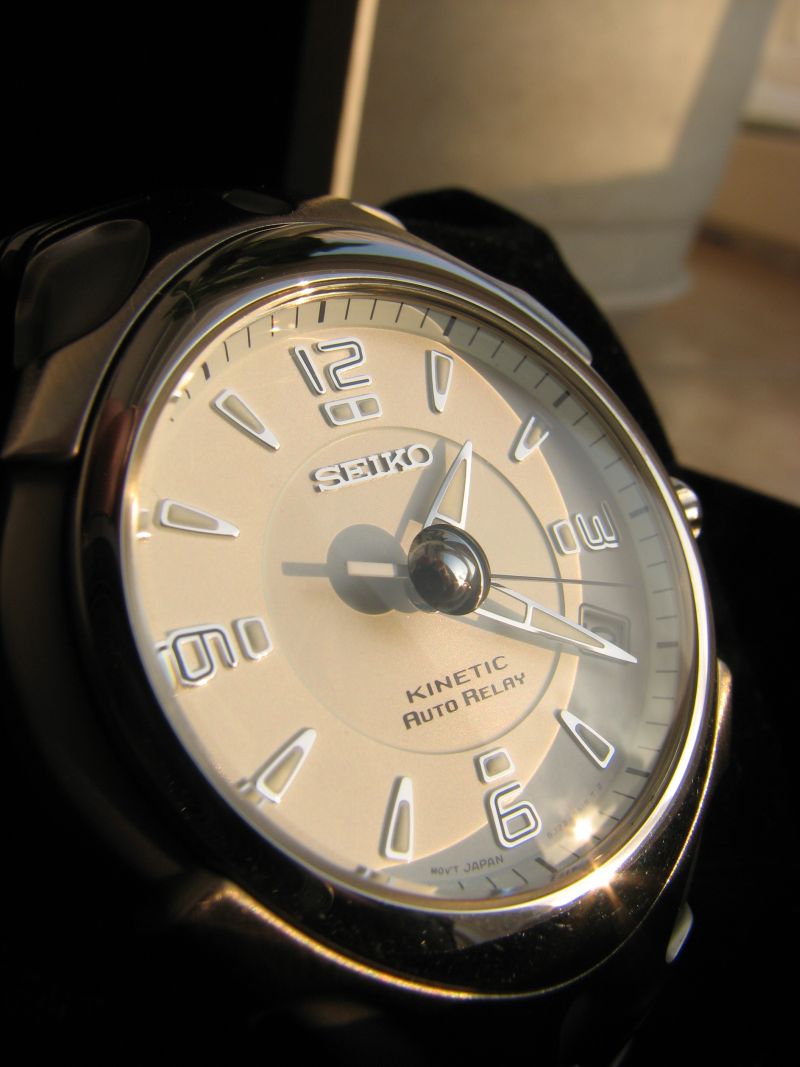 Однако, произошло то, что могло произойти. Часы приглянулись мне самому. На них было написано «KINETIC». Именно это слово в июле 2009 я и набрал в поисковике. Я стал читать, стал собирать информацию. Я узнал, что эта надпись на циферблате принадлежит «SEIKO». Если честно, то мне очень, понравилась сама эта идея – автокварц. Идея, собственно, вечного двигателя. Казалось бы, столько копий сломано на эту тему. Опять же, есть механика с автоподзаводом. Не буду на это ничего возражать. Лично мне, в автокварце понравилось то, что эта древняя идея было решена на новом, современном уровне, уровне моего века. Те электроны, что рождаются под циферблатом в генераторе, накапливаются в аккумуляторе, а два двигателя, что крутят стрелки - все это работает! Ра-бо-та-ет!!! Вот она, Легенда! Конечно, можно возразить, - «да, каждый из нас за свою жизнь уже видел с десяток-другой генераторов, перезарядил около тысячи раз всяких аккумуляторов, а моторов различных конструкций в детстве только ленивый не разбирал». Ну, очень ленивый. «Все так», - скажу я, - «но только вот это все вместе работает (и работает) у меня на запястье». Такое маленькое, что должно быть другие, маленькие люди создали все это. Тут можно рассмеяться и сказать, - «кто же еще, конечно, японцы!»