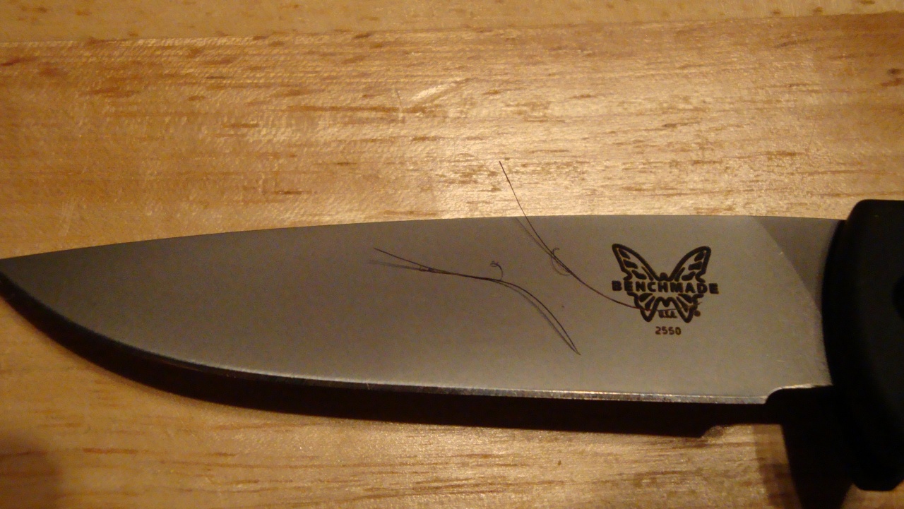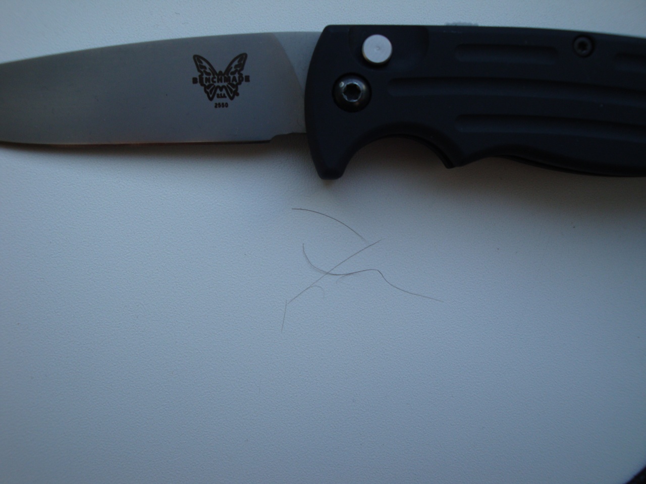 Вот мои фотки Бенчика, заточенного до субмикронной толщины кромки. Волос строгает. Конечно, не как у Васи. Но строгает.
