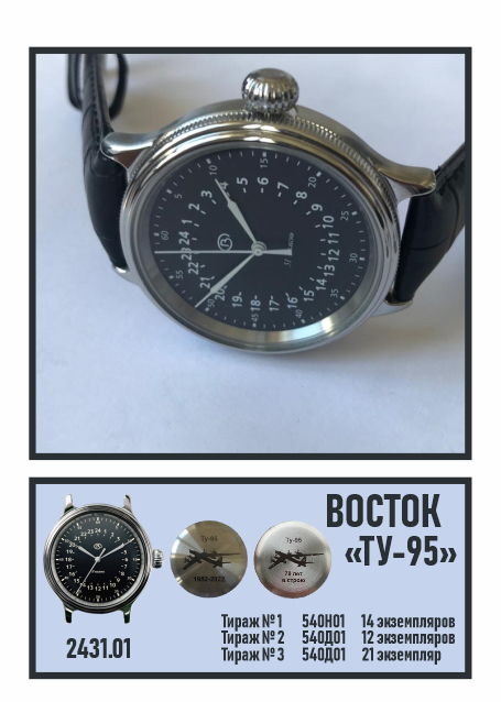 «ТУ-95». Данный проект первоначально являлся экспериментом, с целью представить как будет выглядеть навигационный хронометр на компонентах ЧЧЗ Восток, механизм на котором построен проект 2431.02 – суточник на 32 камнях, надпись «31 камень» I-м выпуске часов, является опечаткой, осталась от предыдущего эскиза автора (Novartep), так она появилась на ТУ-95 I-го выпуска, проект не планировался автором к реализации и был загружен на форум в общий доступ, участникам форума данный эскиз понравился, но к моменту когда форумчане решили запустить этот проект в производство у автора уже не было векторного изображения циферблата. Для составления заводского макета дизайнеры ЧЧЗ предположительно и использовали изображение загруженное на форум в общий доступ, таким способом надпись «31 камень» попала часы реализованные «в металле»