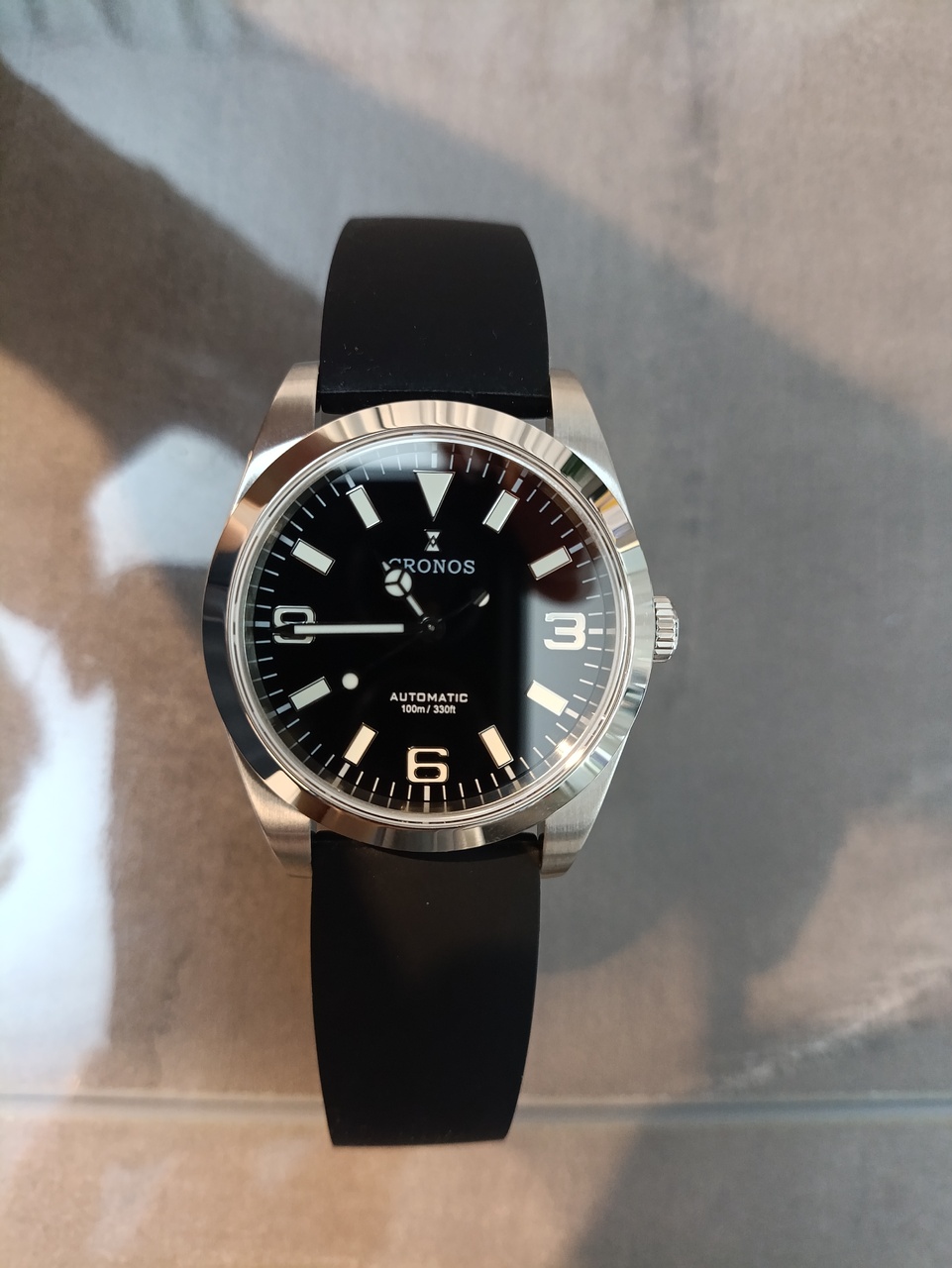 Даже довольно убогий накладной логотипчик не особо раздражает ввиду своих крошечных размеров. И да, он симметричен относительно надписи cronos. Люм на метках и стрелках оказался желтее, чем предполагалось, но хотя-бы везде одного тона. Светит отменно. Недорослая и худосочная часовая стрелка тоже особого отторжения не вызывает. Размер 39мм - прекрасно подходит на запястье 17-18 см. Хорошо что не взял 36. На браслете ещё было-бы в натяг, на ремешке смотрелись-бы совсем крошечно.