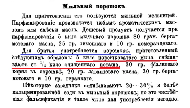 есть по бритьевым мылам и более старинные книженции - "Лейхс Э.Ф. - Искусство мыловарения в полном его практическом объеме,