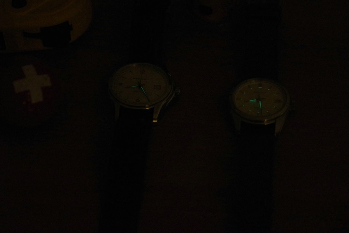 На Хамильтоне в полной темноте тоже видны тоненькие светящиеся метки, но сфотать их запросто не вышло... Люм на Хэмах чуток слабже, но в целом часы все же покруче за счет механизма.