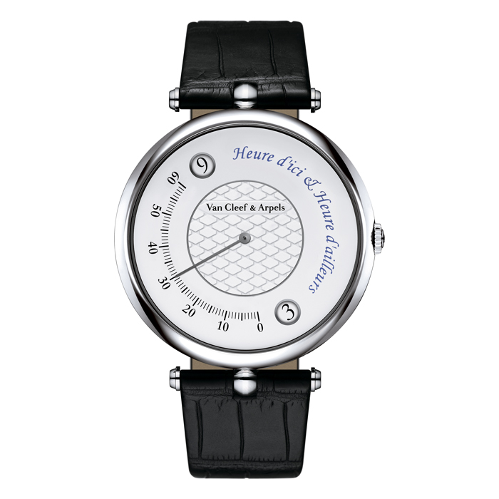 Компания Van Cleef and Arpels показала на выставке и другие часы. Нам особенно пришлись по вкусу мужские Pierre Arpels Heure d’ici & Heure d’ailleurs — их механизм создан фабрикой Agenhor, в нем есть такие усложнения как двойной прыгающий час (в окошках показывается местное и домашнее время) и ретроградный счетчик минут. Значения в обоих окошках переключаются одновременно. Циферблат с узором пике покрыт белым лаком. Механизм автоматический, сектор автоподзавода выполнен из платины. Корпус сделан из белого золота (42 мм), заводная головка украшена бриллиантом.