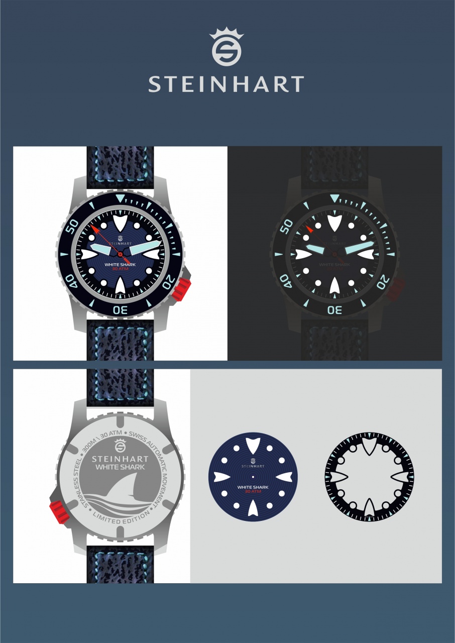 Циферблат / Dial : Сендвич , черный / темно-синий , надписи : "Steinhart + лого" и "WHITE SHARK" - накладные , стальные полированные , "30 ATM" - накладные , красные
