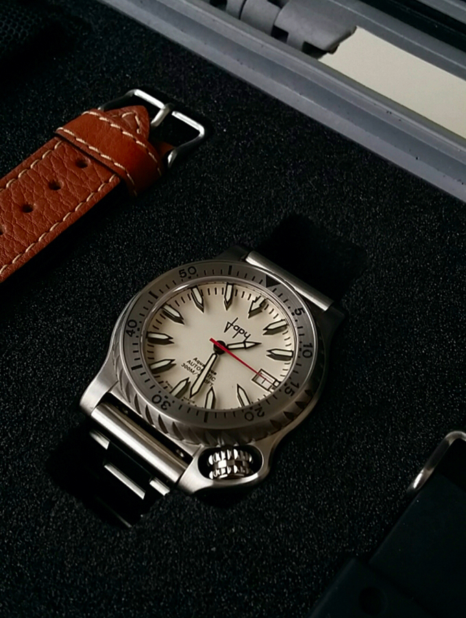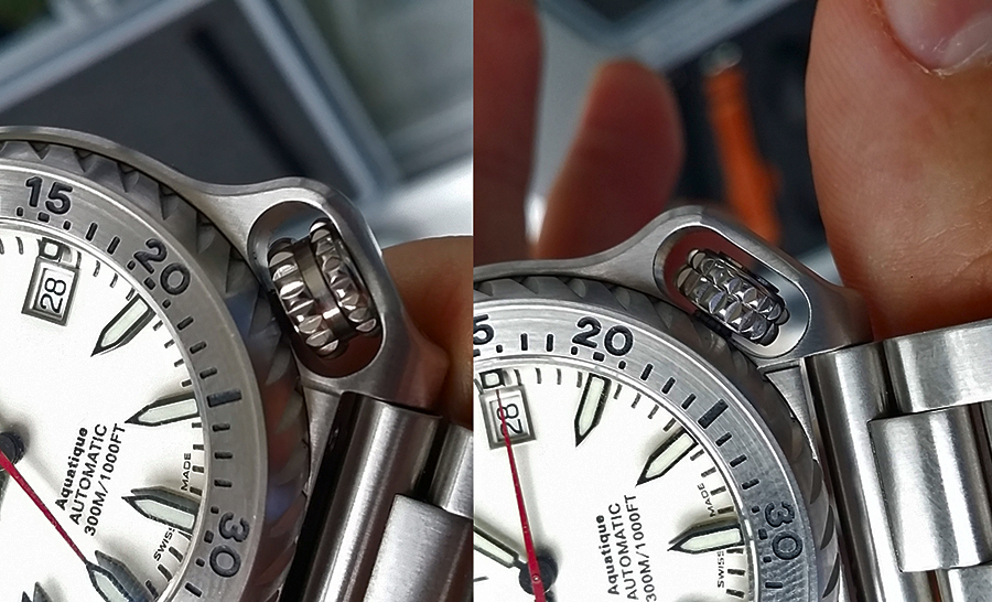 У дайверского модуля ЗГ особой конструкции с дополнительной резьбой. Когда этот модуль встаёт в браслет, внешнюю часть ЗГ можно раскрутить так, что бы она упиралась в скобу и фиксировала (герметизировала?) ЗГ. Я не скажу, что это уж очень удобно, но любая свежая идея в этой области это уже прорыв!