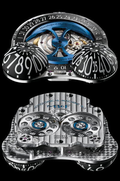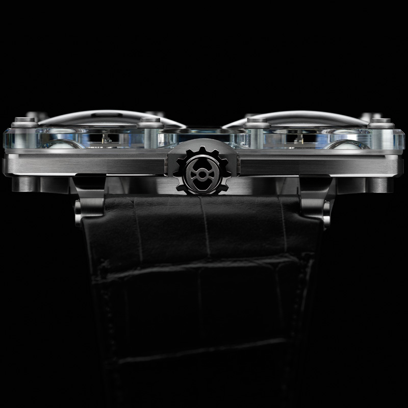 Плавно изогнутая сапфировая панель с верхней стороны корпуса позволяет детально рассмотреть балансовый мост, который имеет обтекаемую форму. Его центральная часть срезана так, чтобы максимально открыть колесо баланса и продемонстрировать истинную «кинетику», свойственную «кинетическим скульптурам» MB&F.