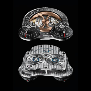 С технической точки зрения, у корпуса также три секции, но включают они следующее: «носовая» часть из титана, объединяющая циферблаты и подвижные ушки; центральная часть из сапфирового стекла, открывающая необычайно широкий 360-градусный обзор механизма с тщательной ручной отделкой; и «кормовая» часть, сужающаяся к двум заводным коронкам и обрамляющая баланс, который поддерживается аэродинамическим мостом. О методах, заимствованных из аэронавтики, свидетельствуют вынесенные наружу винты, которые плотно и в то же время элегантно соединяют все три части, обеспечивая жесткость и водостойкость конструкции.