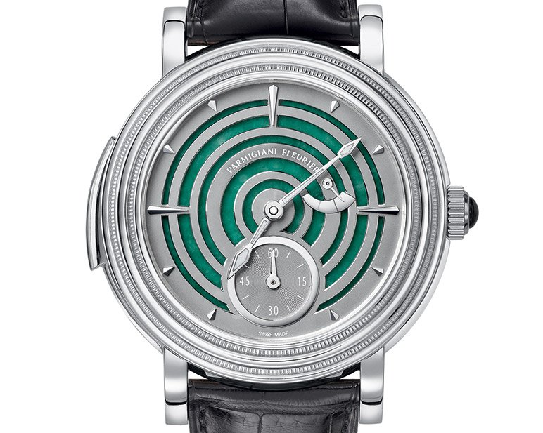 Циферблат из зеленого бирманского нефрита; накладные концентрические кольца, стилизованные под лабиринт, а также часовые индексы, выполненные, как и стрелки, из 18-каратного белого золота.